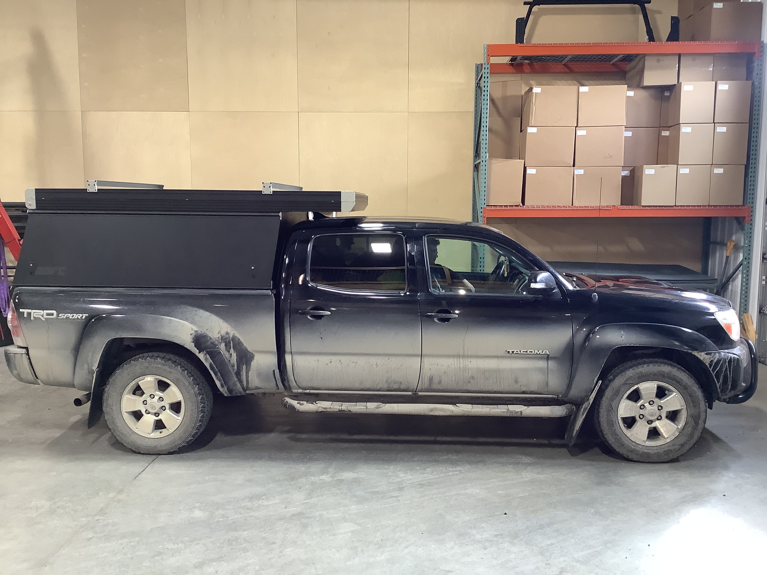 Product: Platform Camper Panel Color: Black GFC Options: Windows, Beef Rack, Side Door Year: 2015 Make: Toyota Model: Tacoma Cab/Bed: Double Cab 6 Foot Truck Color Black Wheels: Stock Suspension: Stock Tire: Goodyear Wrangler 265/70/R17 Mods: All I need is a GFC Instagram Handle: @jrryoung Install Date: 2022-04-29 Location: California