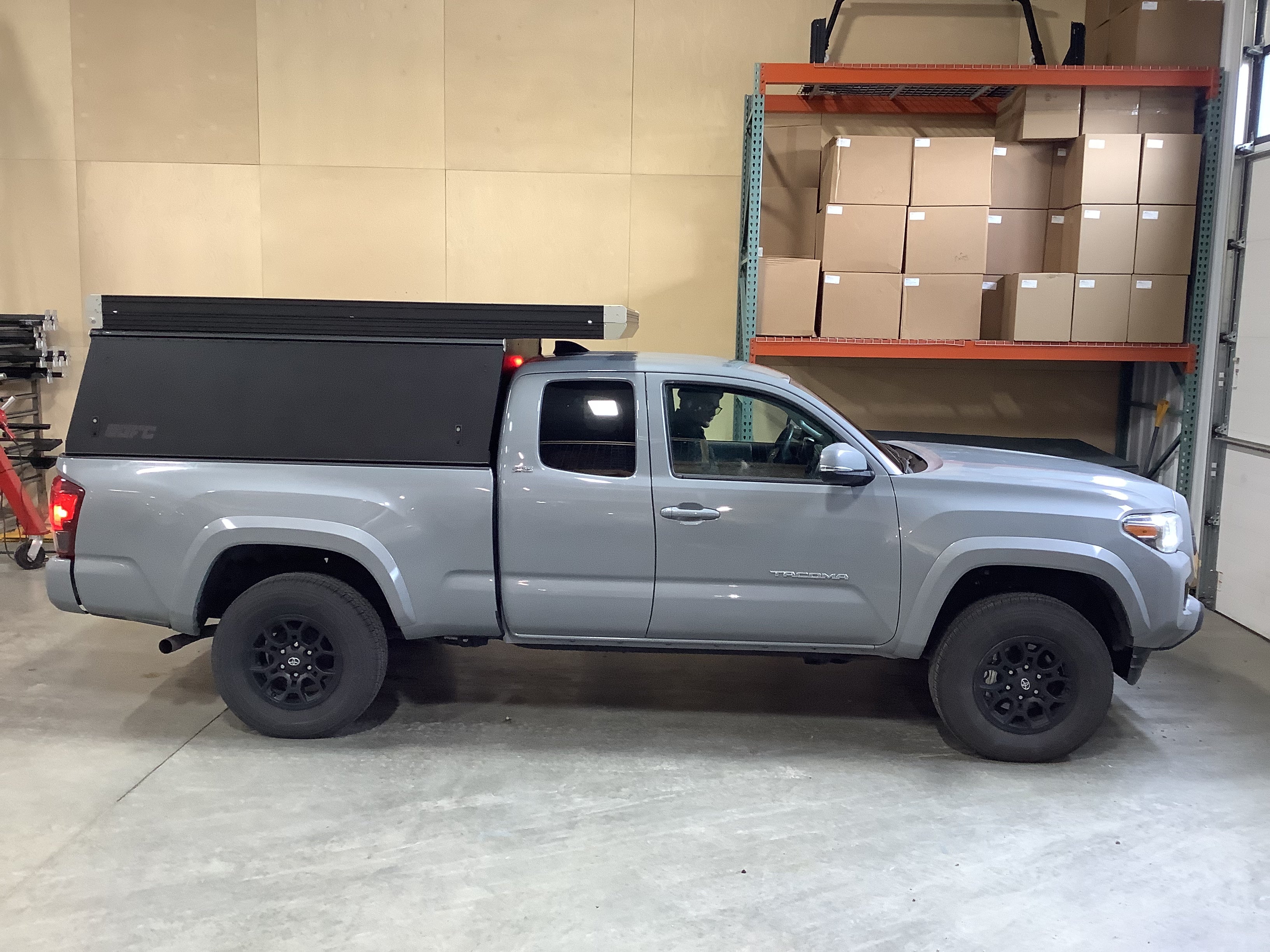 Product: Platform Camper Panel Color: Black GFC Options: Side Door Year: 2021 Make: Toyota Model: Tacoma Cab/Bed: Access Cab 6 Foot Truck Color Gray Wheels: Stock Suspension: Stock Tire: Goodyear Wrangler 265/70/R16 Mods: All I need is a GFC Instagram Handle: None Install Date: 2022-04-29 Location: California