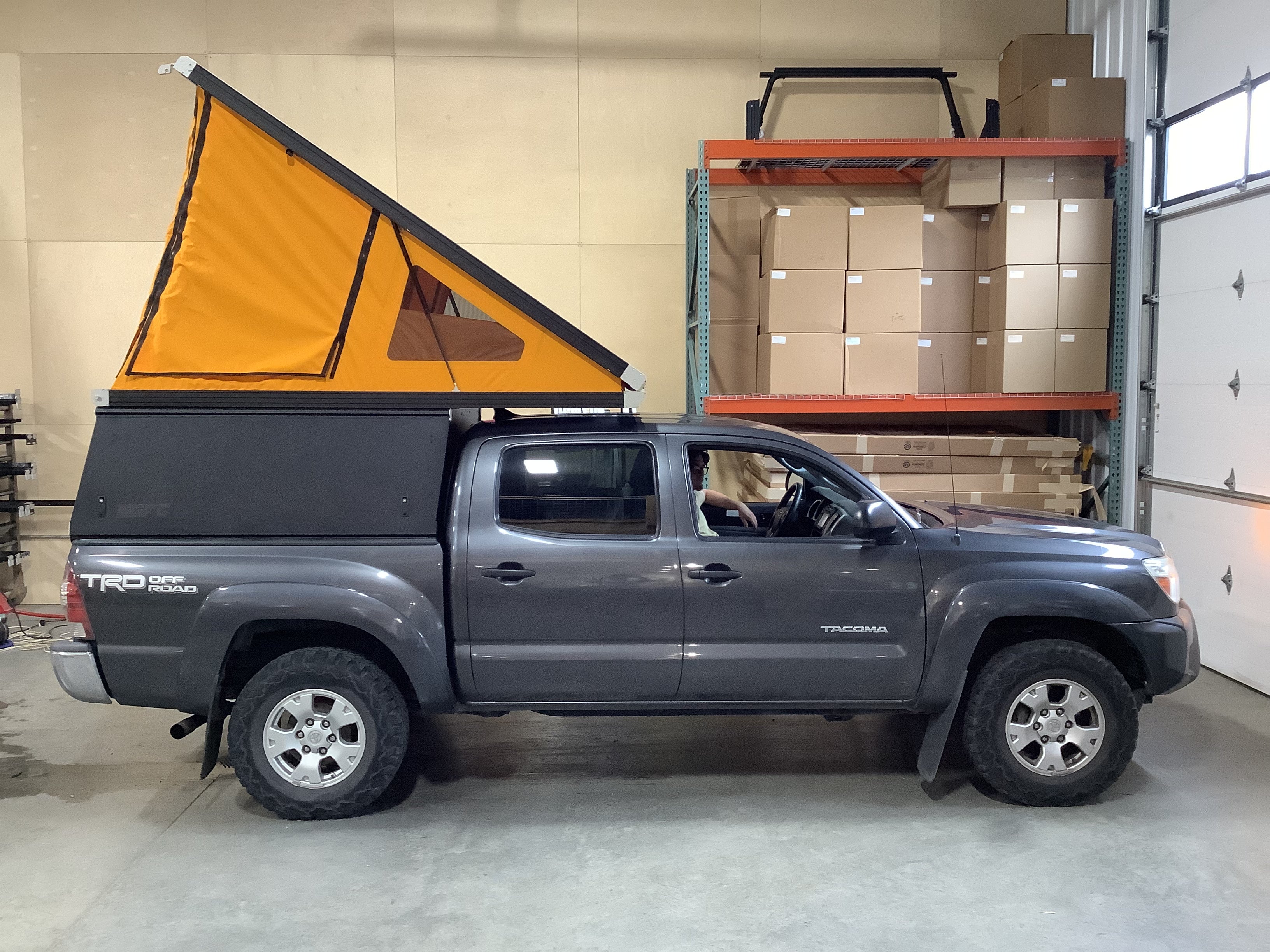 Product: Platform Camper Panel Color: Black GFC Options: Windows, Side Door Year: 2015 Make: Toyota Model: Tacoma Cab/Bed: Double Cab 5 foot Truck Color Gray Wheels: Stock Suspension: Stock Tire: BFG KO2 265/75/R16 Mods: All I need is a GFC Instagram Handle:None Install Date: 2022-06-04 Location: Colorado