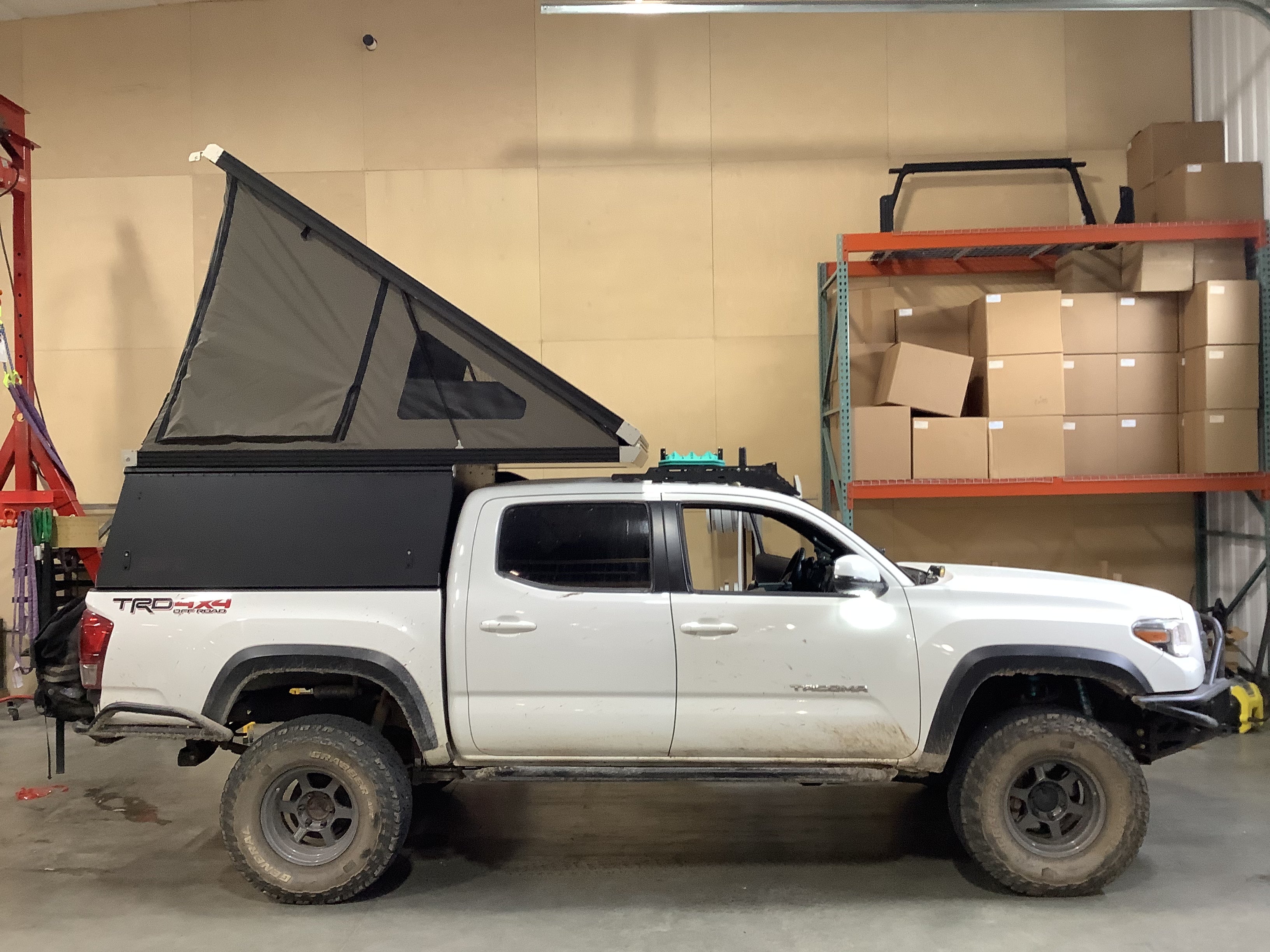 Product: Platform Camper Panel Color: Black GFC Options: Side Door Year: 2017 Make: Toyota Model: Tacoma Cab/Bed: Double Cab 5 foot Truck Color White Wheels: Volk Suspension: King, Total Chaos Tire: General Grabber 285/75/R16 Mods: BAMF , Baja Designs Lighting, Martin Rack Instagram Handle: Install Date: 2022-07-07 Location: CA