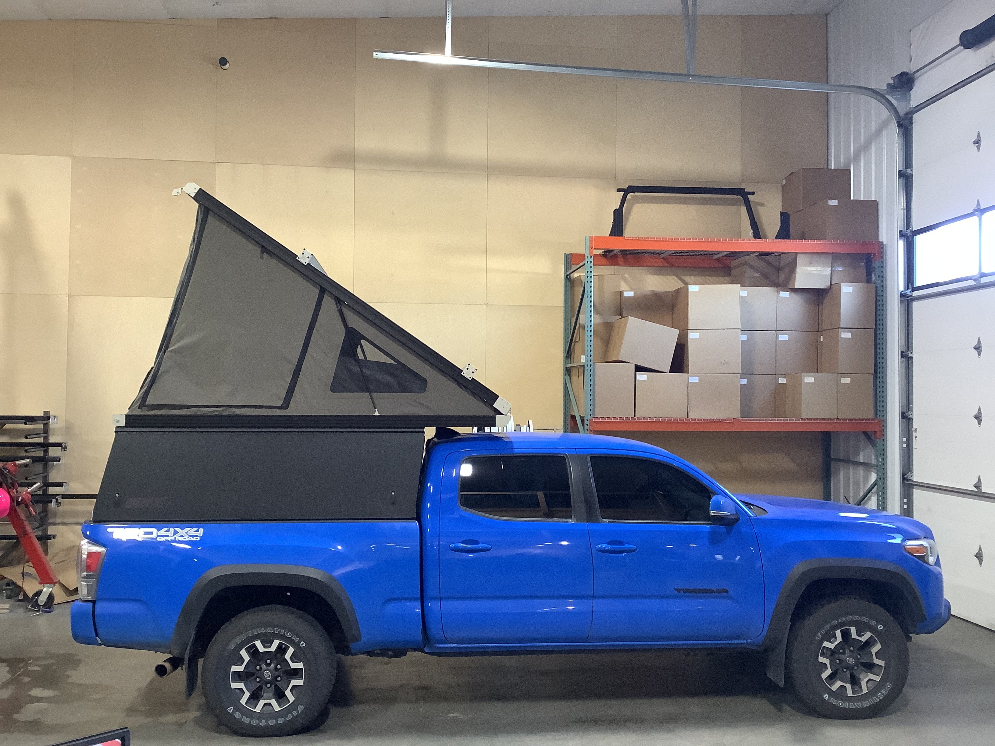Product: Platform Camper Panel Color: Destroyer Blue GFC Options: Windows, Side Door, Beef Rack Year: 2020 Make: Toyota Model: Tacoma Cab/Bed: Double Cab 6 Foot Truck Color Blue Wheels: Stock Suspension: Stock Tire: Firestone Destination 265/70/R16 Mods: All I need is a GFC Instagram Handle: Install Date: 2022-07-02 Location: CO