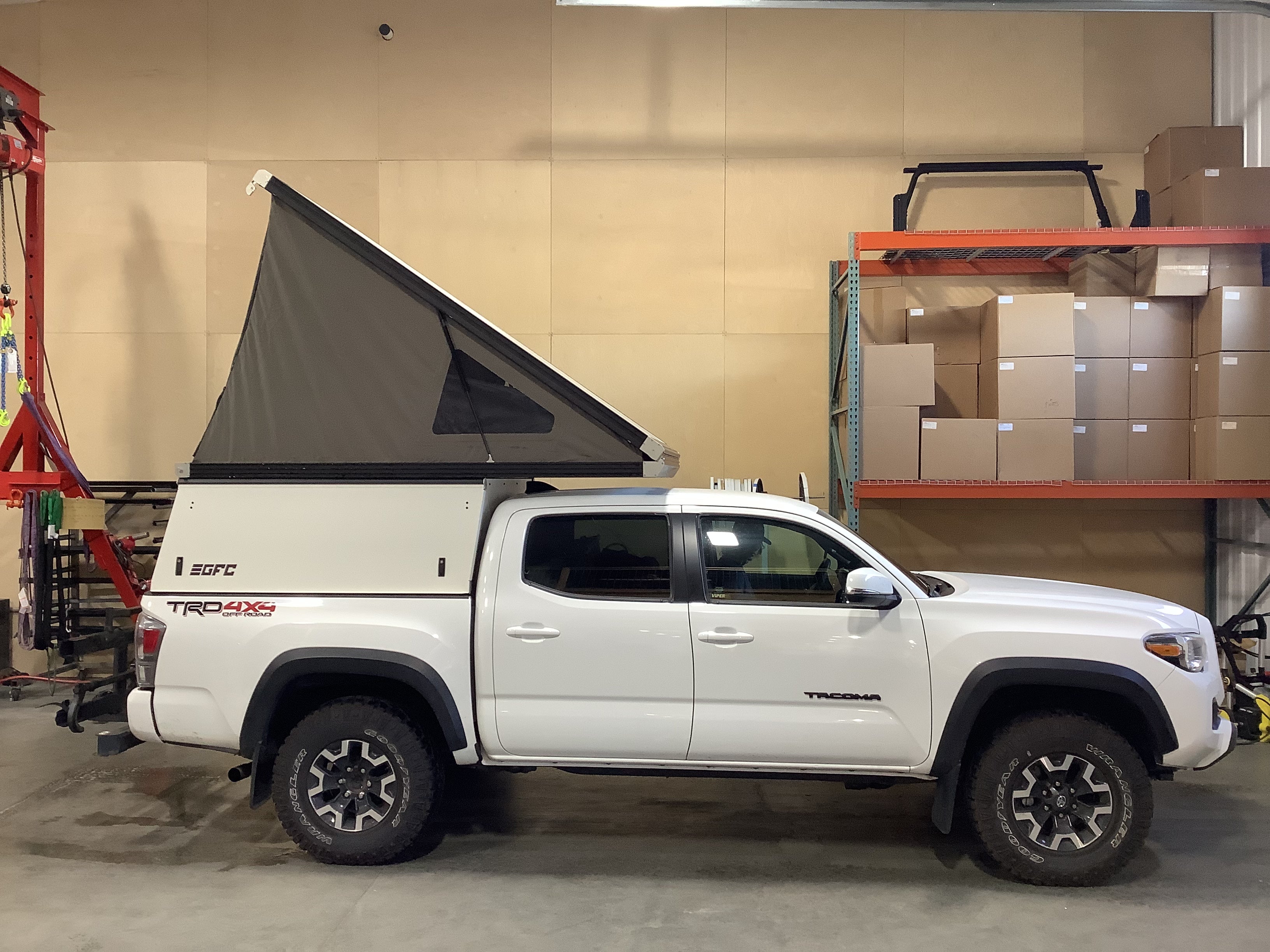 Product: Platform Camper Panel Color: White GFC Options: Windows Year: 2021 Make: Toyota Model: Tacoma Cab/Bed: Double Cab 5 foot Truck Color White Wheels: Stock Suspension: Stock Tire: Goodyear Wrangler Duratrac 265/75/R16 Mods: All I need is a GFC Instagram Handle: Install Date: 2022-07-10 Location: CO