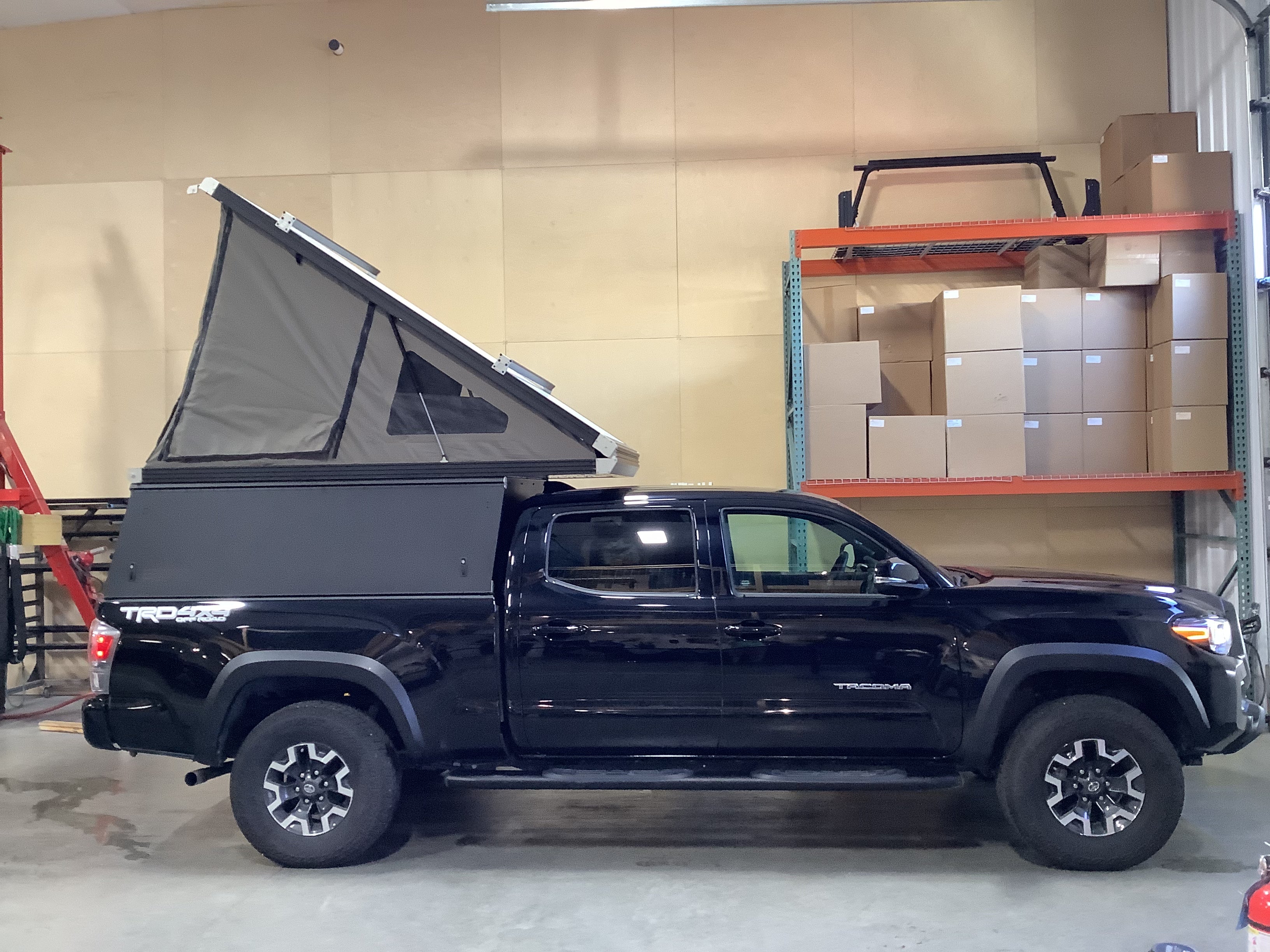 Product: Platform Camper Panel Color: Black GFC Options: Windows, Side Door, Beef Rack Year: 2022 Make: Toyota Model: Tacoma Cab/Bed: Double Cab 6 Foot Truck Color Black Wheels: Stock Suspension: Stock Tire: Goodyear Wrangler 265/70/R16 Mods: All I need is a GFC Instagram Handle: Install Date: 2022-07-14 Location: MI