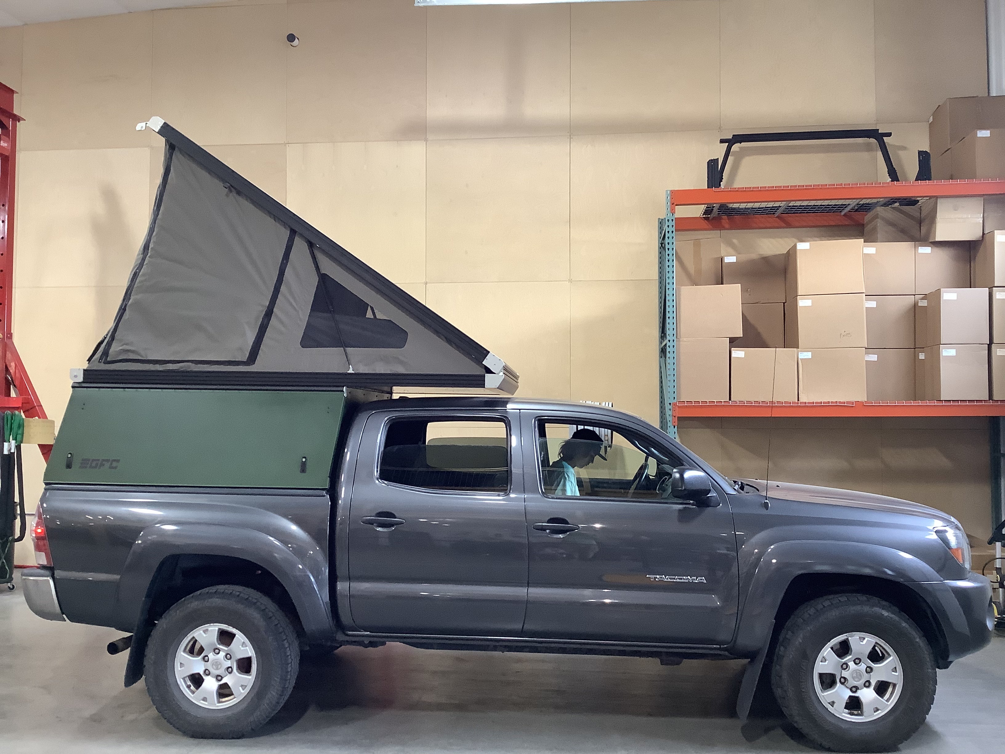 Product: Platform Camper Panel Color: Rifle Green GFC Options: Windows, Side Door Year: 2010 Make: Toyota Model: Tacoma Cab/Bed: Double Cab 5 foot Truck Color Gray Wheels: Stock Suspension: Stock Tire: Yokohama Geolander 265/75/R16 Mods: All I need is a GFC Instagram Handle: Install Date: 2022-07-17 Location: CO