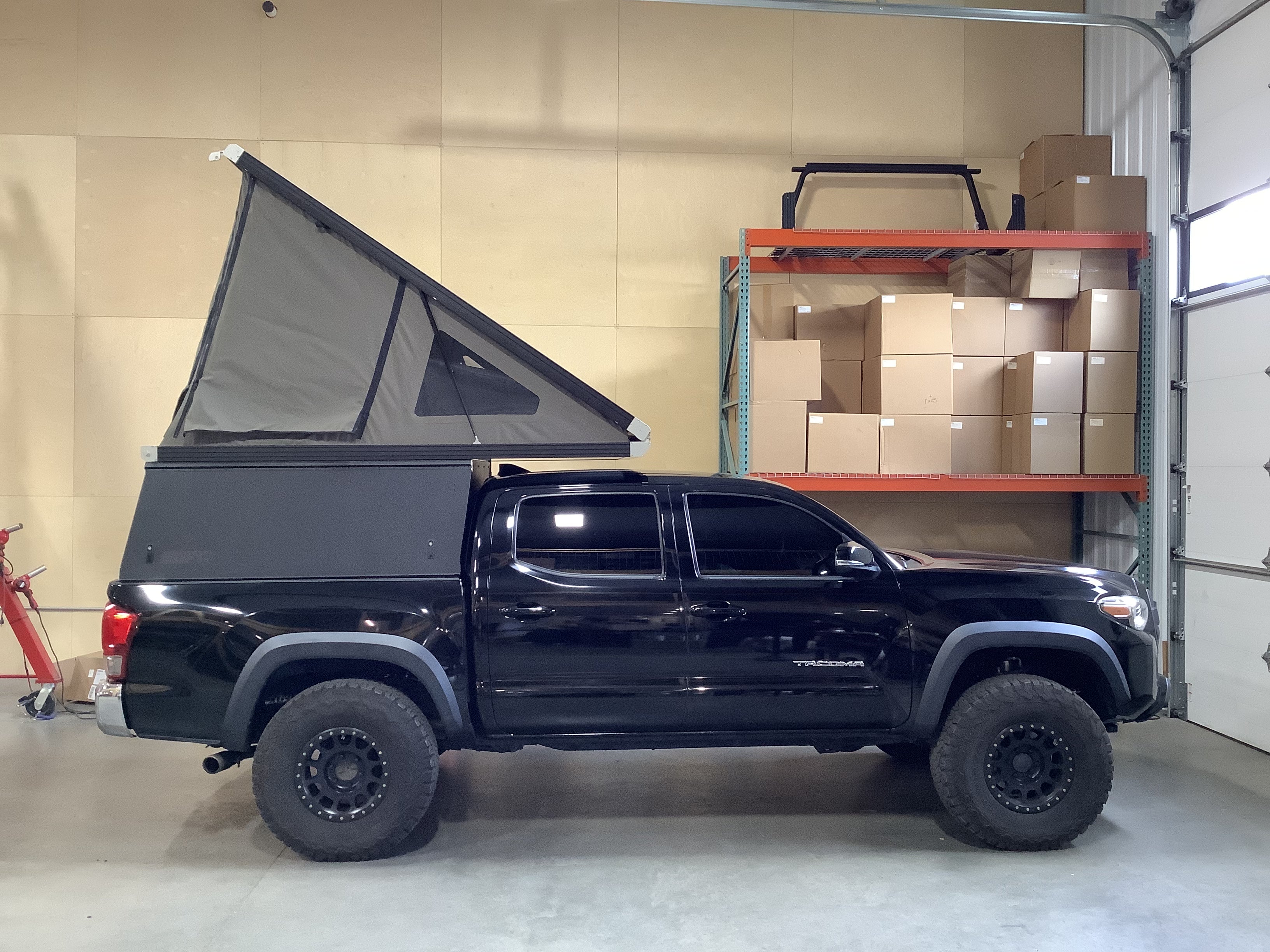 Product: Platform Camper Panel Color: Black GFC Options: Side Door Year: 2017 Make: Toyota Model: Tacoma Cab/Bed: Double Cab 5 foot Truck Color Black Wheels: Method Suspension: Total Chaos, Fox Tire: BFG KO2 295/75/R16 Mods: Baja Designs Lighting Instagram Handle: Install Date: 2022-07-22 Location: CA