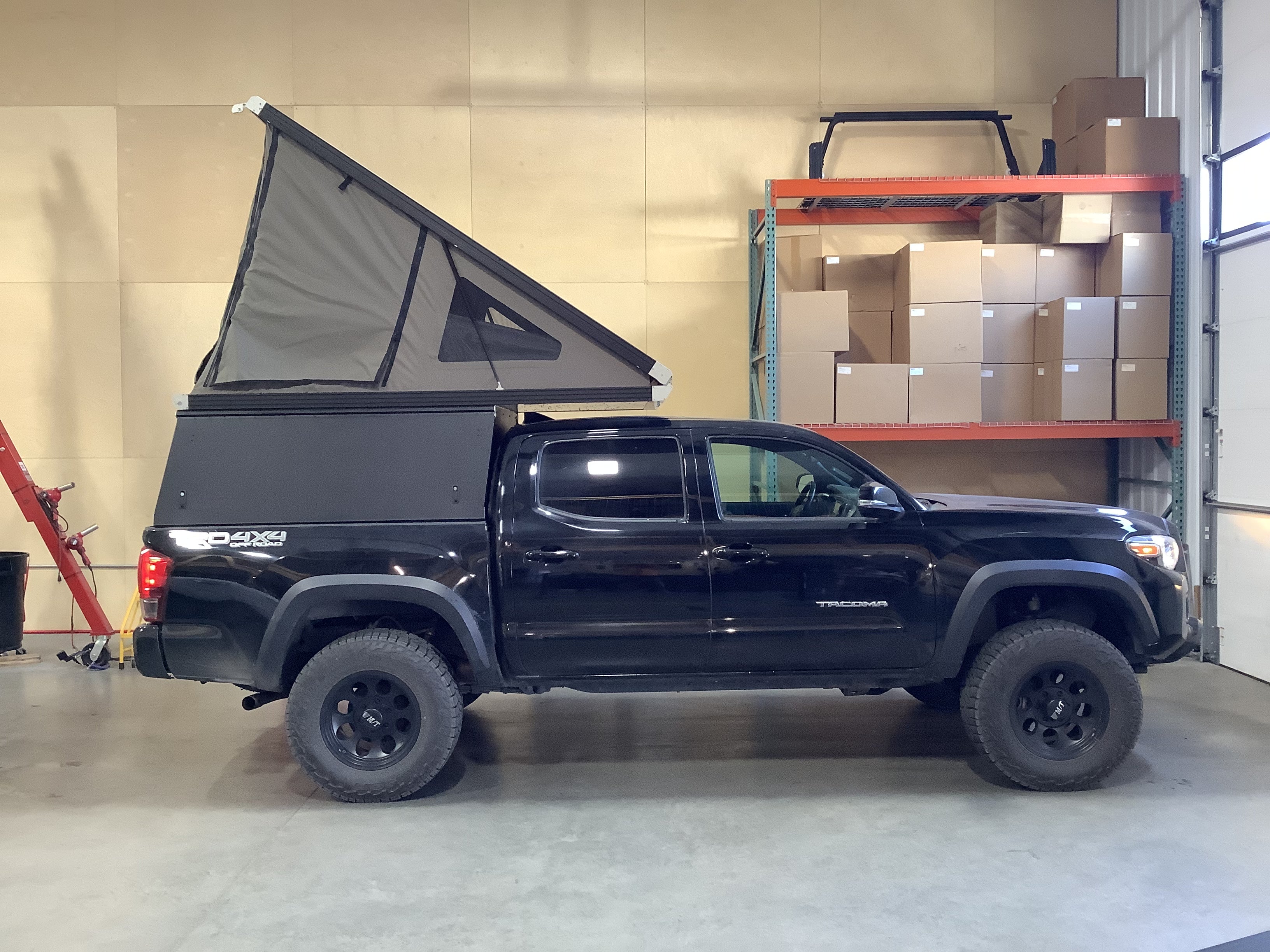 Product: Platform Camper Panel Color: Black GFC Options: Side Door Year: 2016 Make: Toyota Model: Tacoma Cab/Bed: Double Cab 5 foot Truck Color Black Wheels: Mickey Thompson Suspension: Icon Tire: Falken Wildpeak 285/70/R17 Mods: All I need is a GFC Instagram Handle: Install Date: 2022-07-28 Location: CO