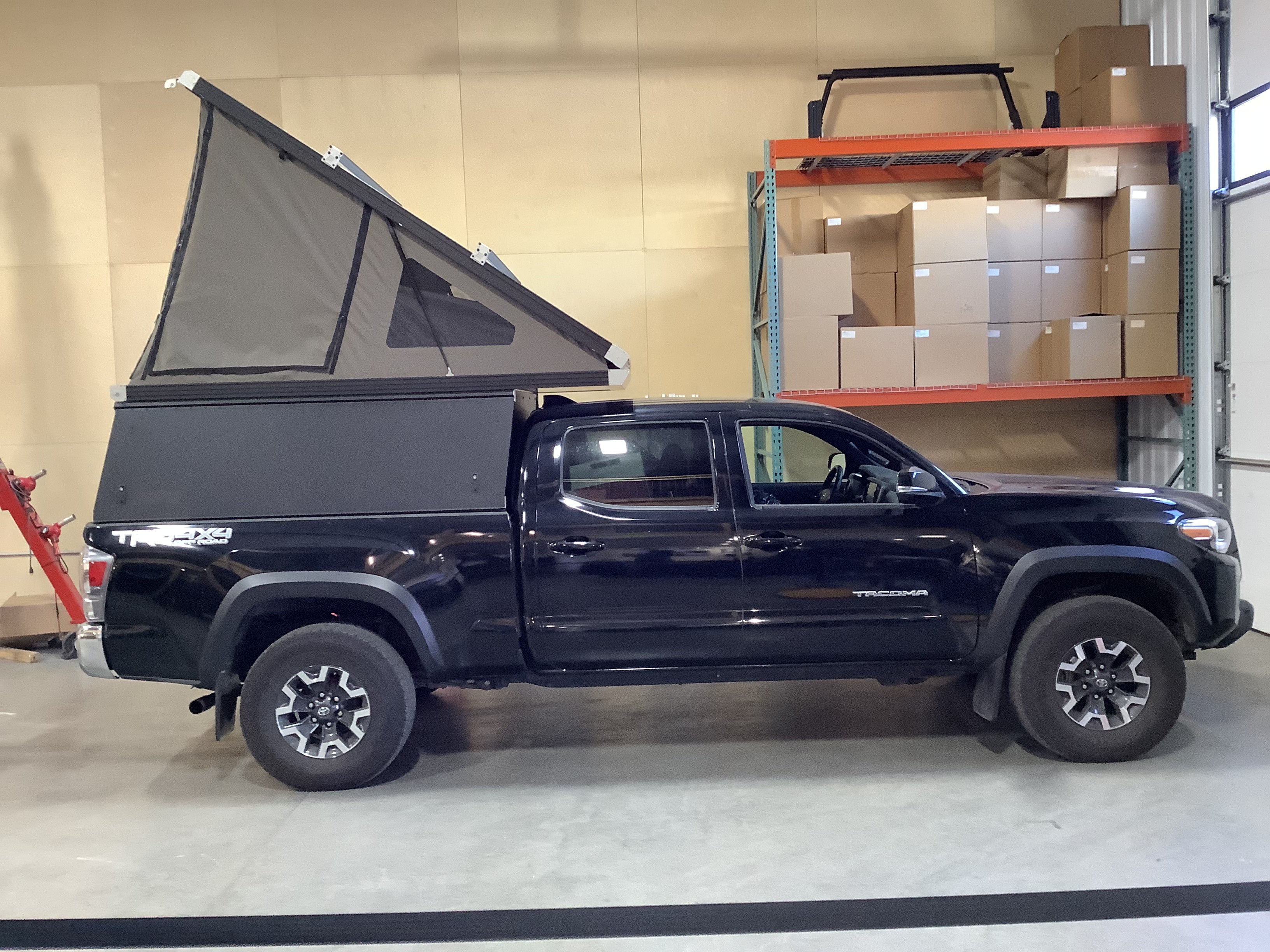 Product: Platform Camper Panel Color: Black GFC Options: Windows, Beef Rack, Side Door Year: 2021 Make: Toyota Model: Tacoma Cab/Bed: Double Cab 6 Foot Truck Color Black Wheels: Stock Suspension: Stock Tire: Goodyear Wrangler 26/70/R16 Mods: All I need is a GFC Instagram Handle:@JRempt Install Date: 2022-08-12 Location: WA