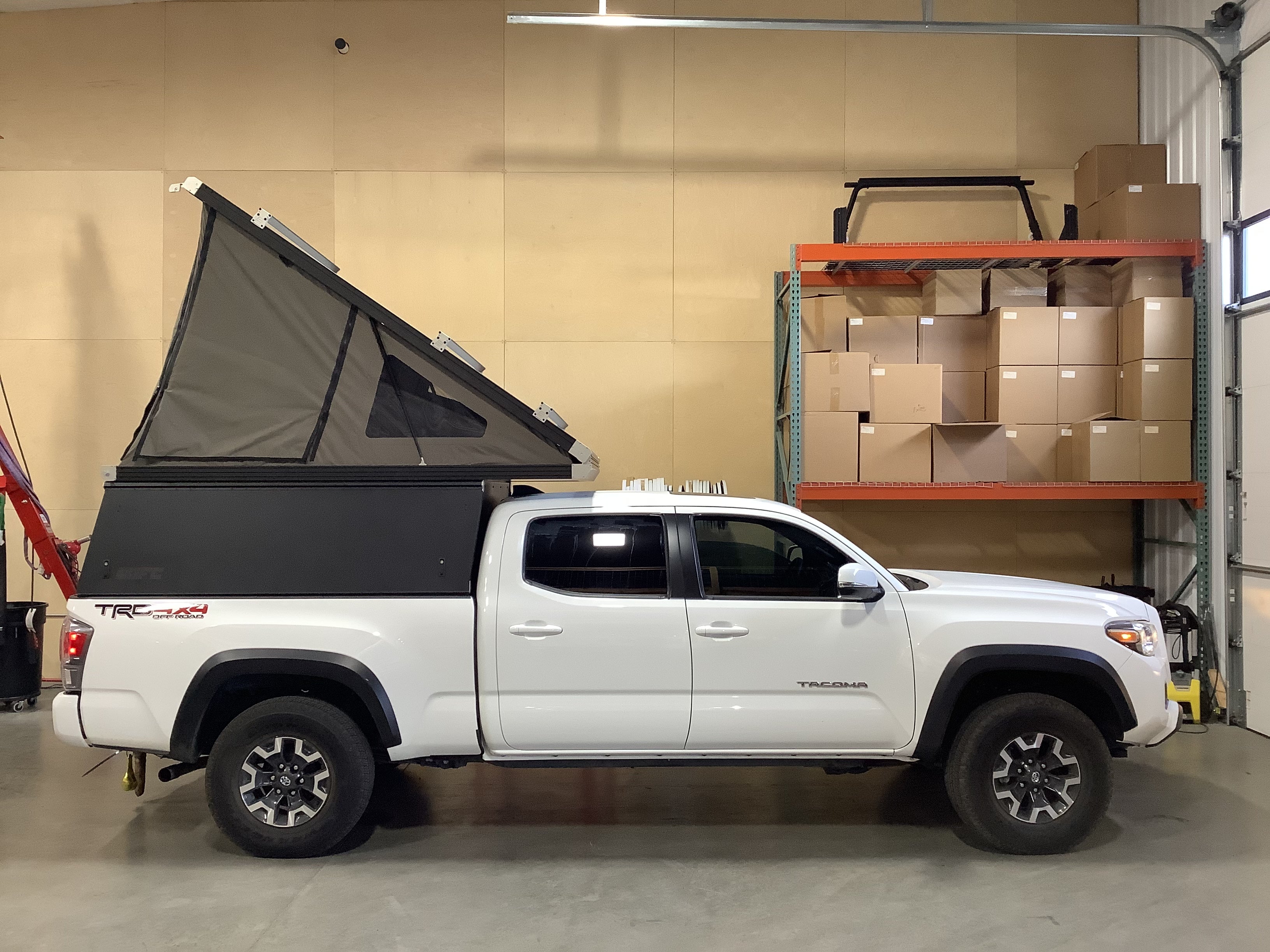 Product: Platform Camper Panel Color: Black GFC Options: Windows, Side Door, Beef Rack Year: 2021 Make: Toyota Model: Tacoma Cab/Bed: Double Cab 6 Foot Truck Color White Wheels: Stock Suspension: Stock Tire: Goodyear Wrangler 265/70/R16 Mods: All I need is a GFC Instagram Handle:@ShayneCo @8UpLife Install Date: 2022-08-28 Location: CA