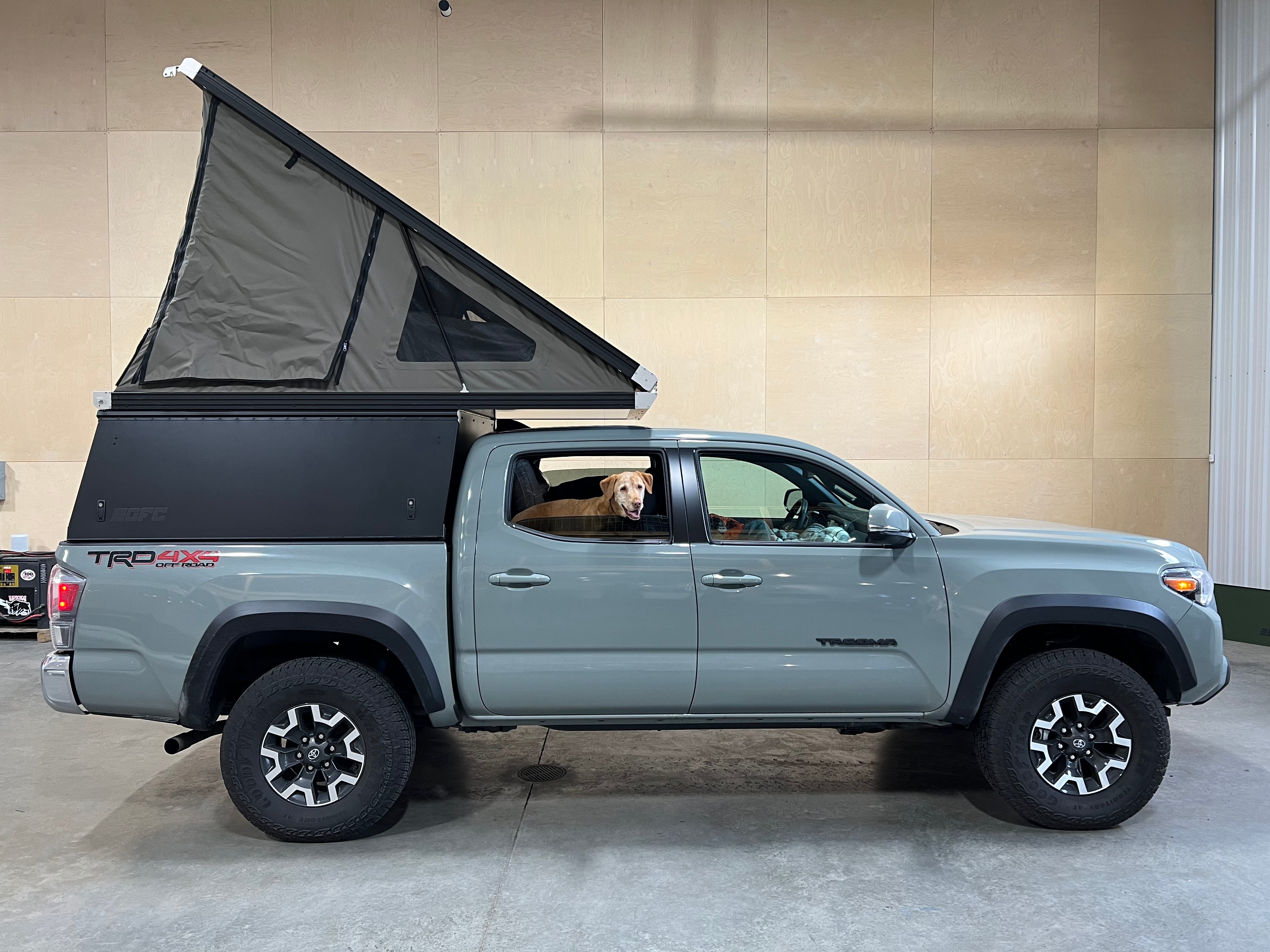 Product: Platform Camper Panel Color: Black GFC Options: Windows, Side Door Year: 2022 Make: Toyota Model: Tacoma Cab/Bed: Double Cab 5 foot Truck Color Gray Wheels: Stock Suspension: Stock Tire: Goodyear Wrangler 265/70/R16 Mods: All I need is a GFC Instagram Handle:@plainstaco Install Date: 2022-10-01 Location: Nebraska