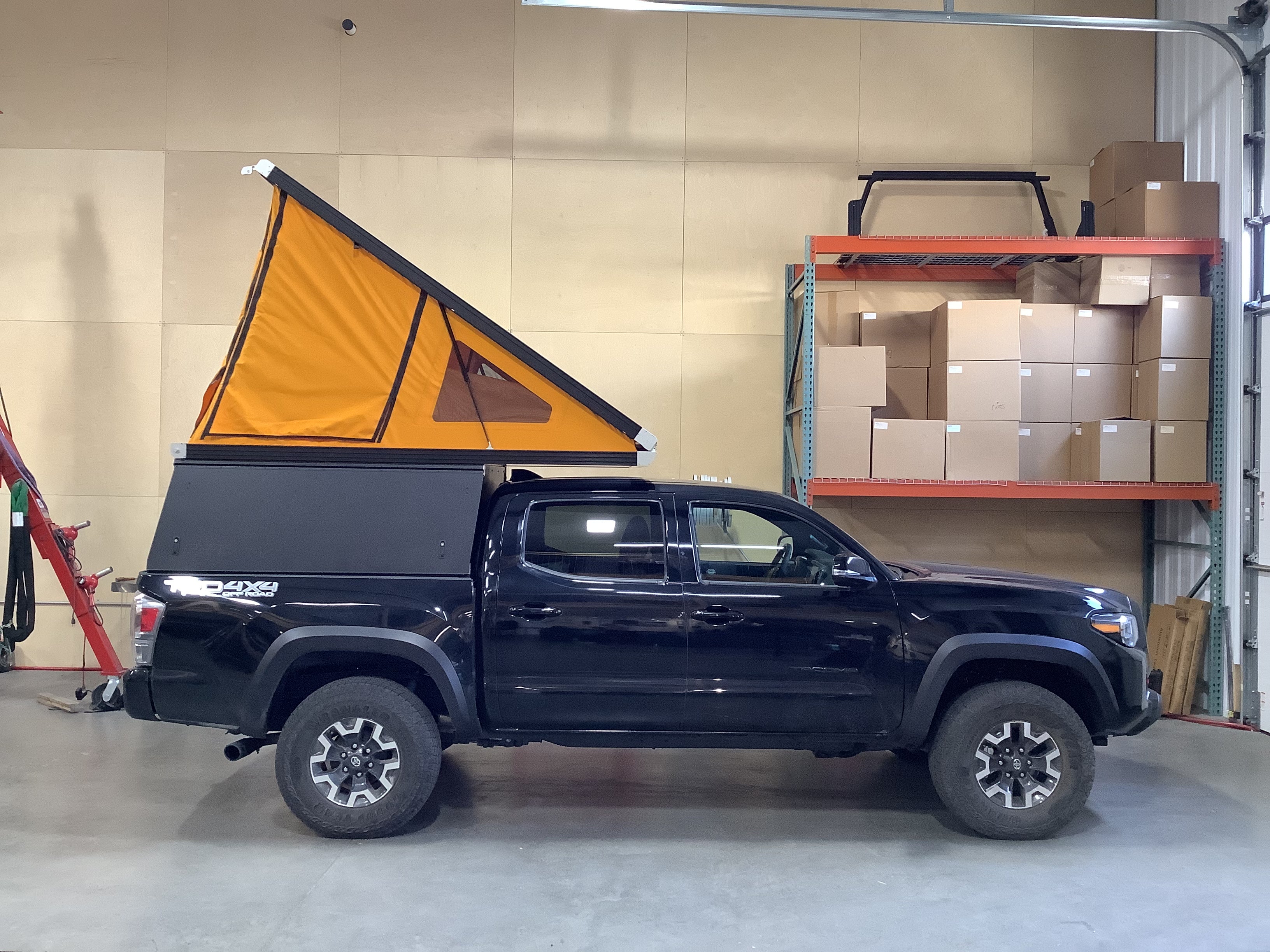 Product: Platform Camper Panel Color: Black GFC Options: Windows, Side Door Year: 2022 Make: Toyota Model: Tacoma Cab/Bed: Double Cab 5 foot Truck Color Black Wheels: Stock Suspension: Stock Tire: Goodyear Wrangler 265/70/R16 Mods: All I need is a GFC Instagram Handle: Install Date: 2022-08-21 Location: MT