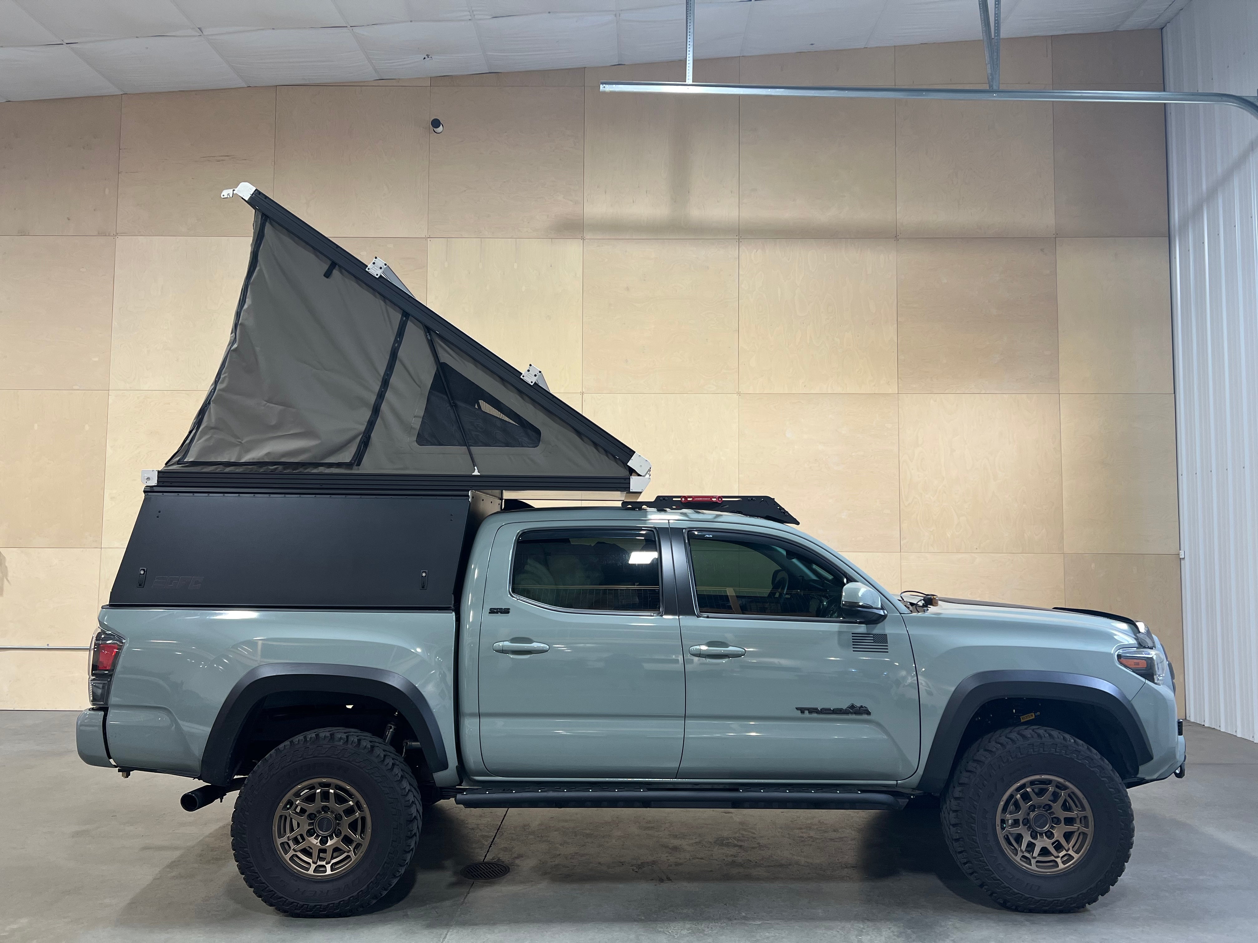 This 2022 Toyota Tacoma is outfitted with a GFC Platform Camper with Black panels. Check out more build specs below.