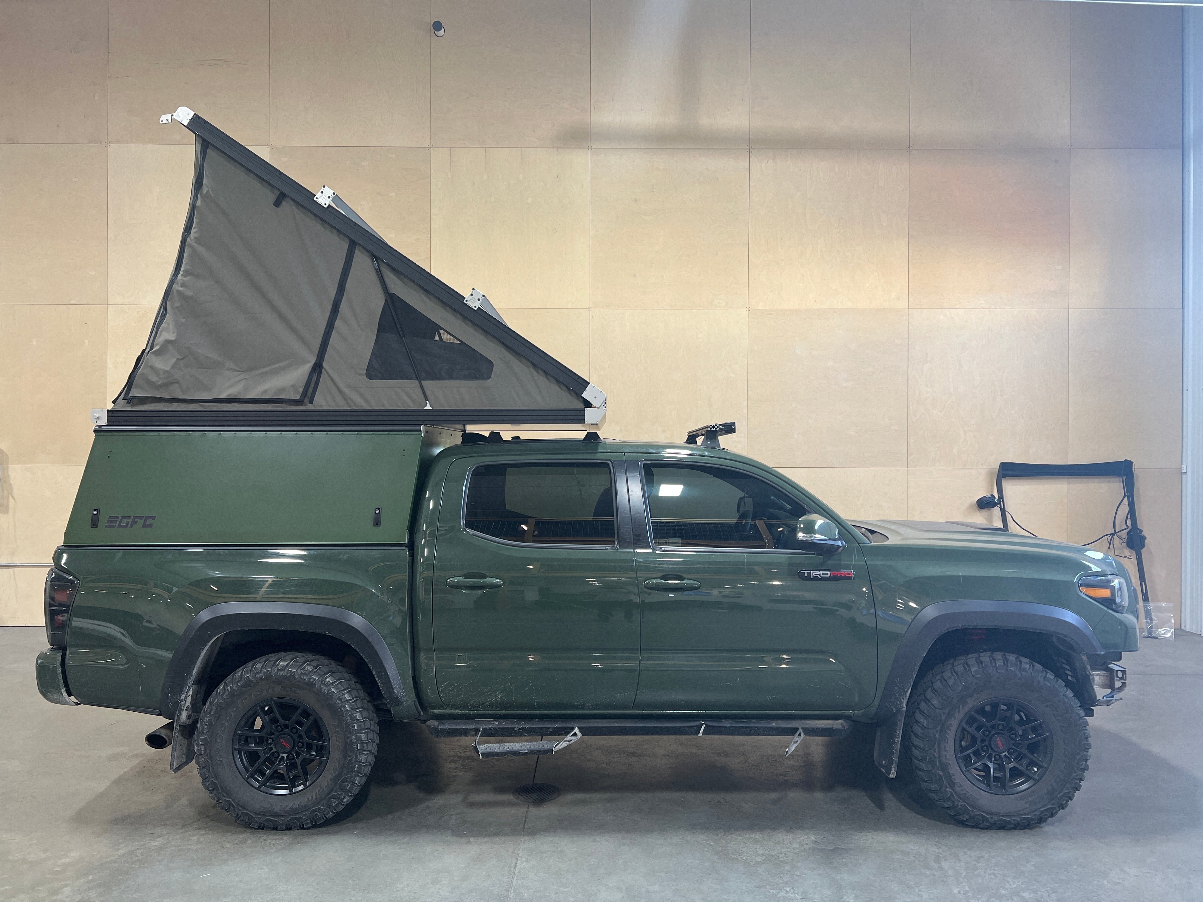 This 2020 Toyota Tacoma is outfitted with a GFC Platform Camper with Rifle Green panels. Check out more build specs below.