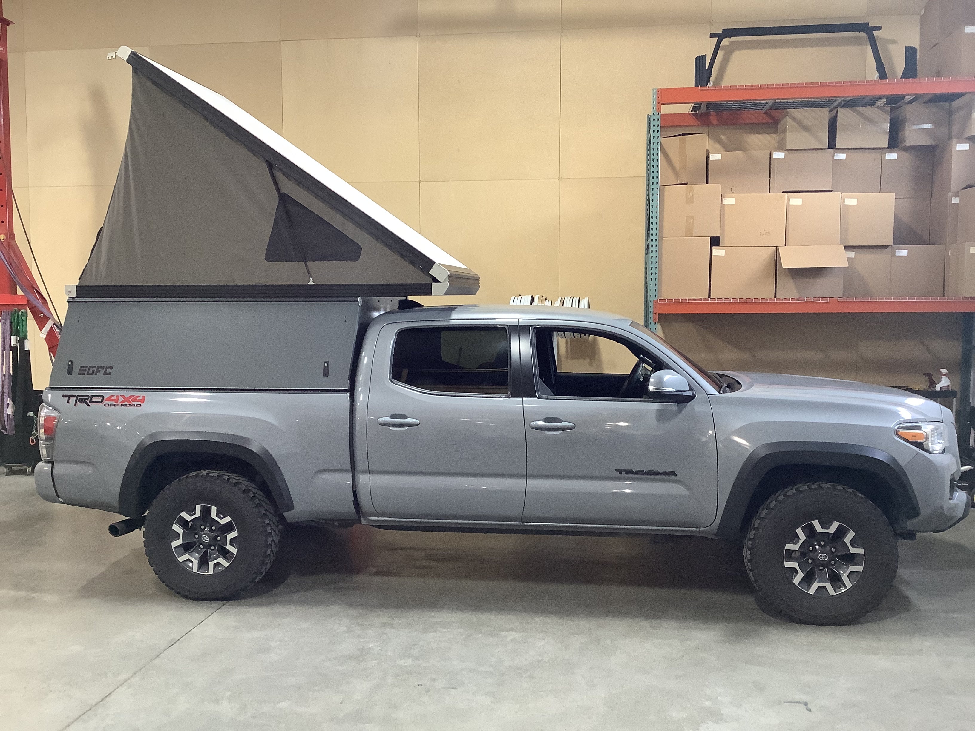 Product: Platform Camper Panel Color: Battleship Gray GFC Options: Windows Year: 2020 Make: Toyota Model: Tacoma Cab/Bed: Double Cab 6 Foot Truck Color Gray Wheels: Stock Suspension: Stock Tire: Cooper Discoverer 265/75/R16 Mods: All I need is a GFC Instagram Handle: None Install Date: 2022-09-18 Location: California