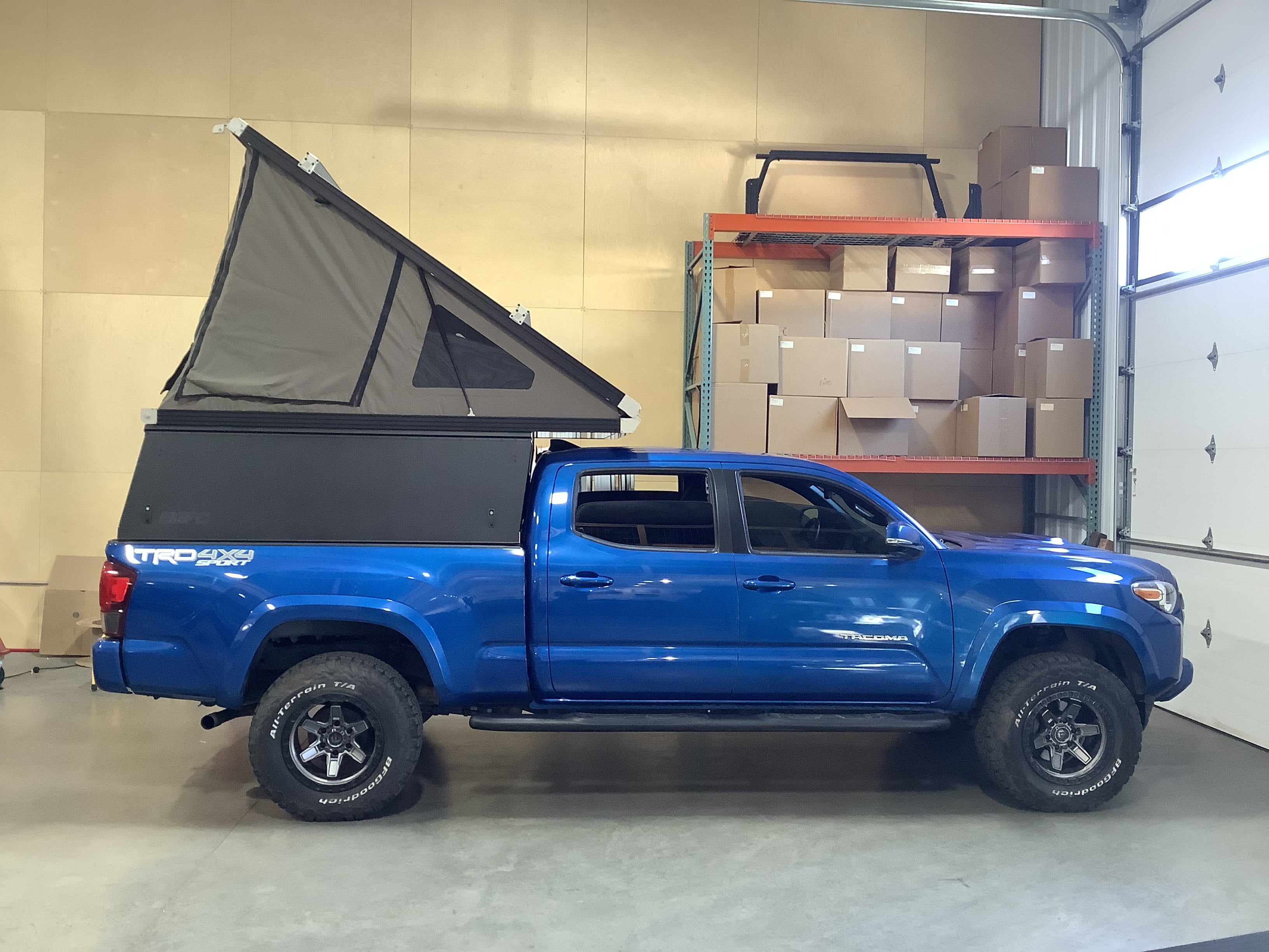 Product: Platform Camper Panel Color: Black GFC Options: Windows, Side Door, Beef Rack Year: 2018 Make: Toyota Model: Tacoma Cab/Bed: Double Cab 6 Foot Truck Color Blue Wheels: Fuel Suspension: Stock Tire: BFG KO2 265/70/R17 Mods: All I need is a GFC Instagram Handle: Install Date: 2022-09-10 Location: MT