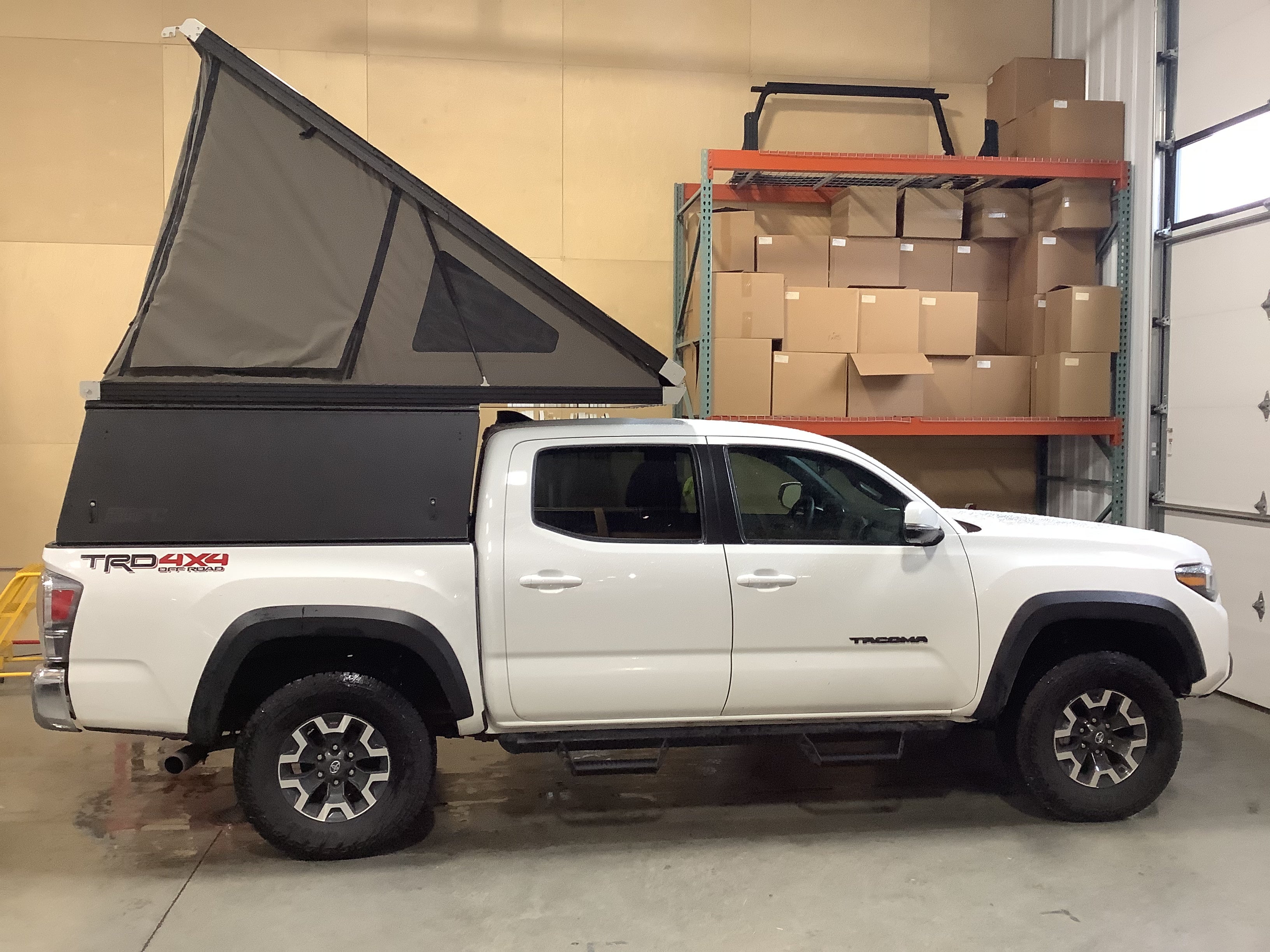 Product: Platform Camper Panel Color: Black GFC Options: Windows, Side Door Year: 2022 Make: Toyota Model: Tacoma Cab/Bed: Double Cab 5 foot Truck Color White Wheels: Stock Suspension: Stock Tire: Goodyear Wrangler 265/70/R16 Mods: All I need is a GFC Instagram Handle: None Install Date: 2022-09-16 Location: California