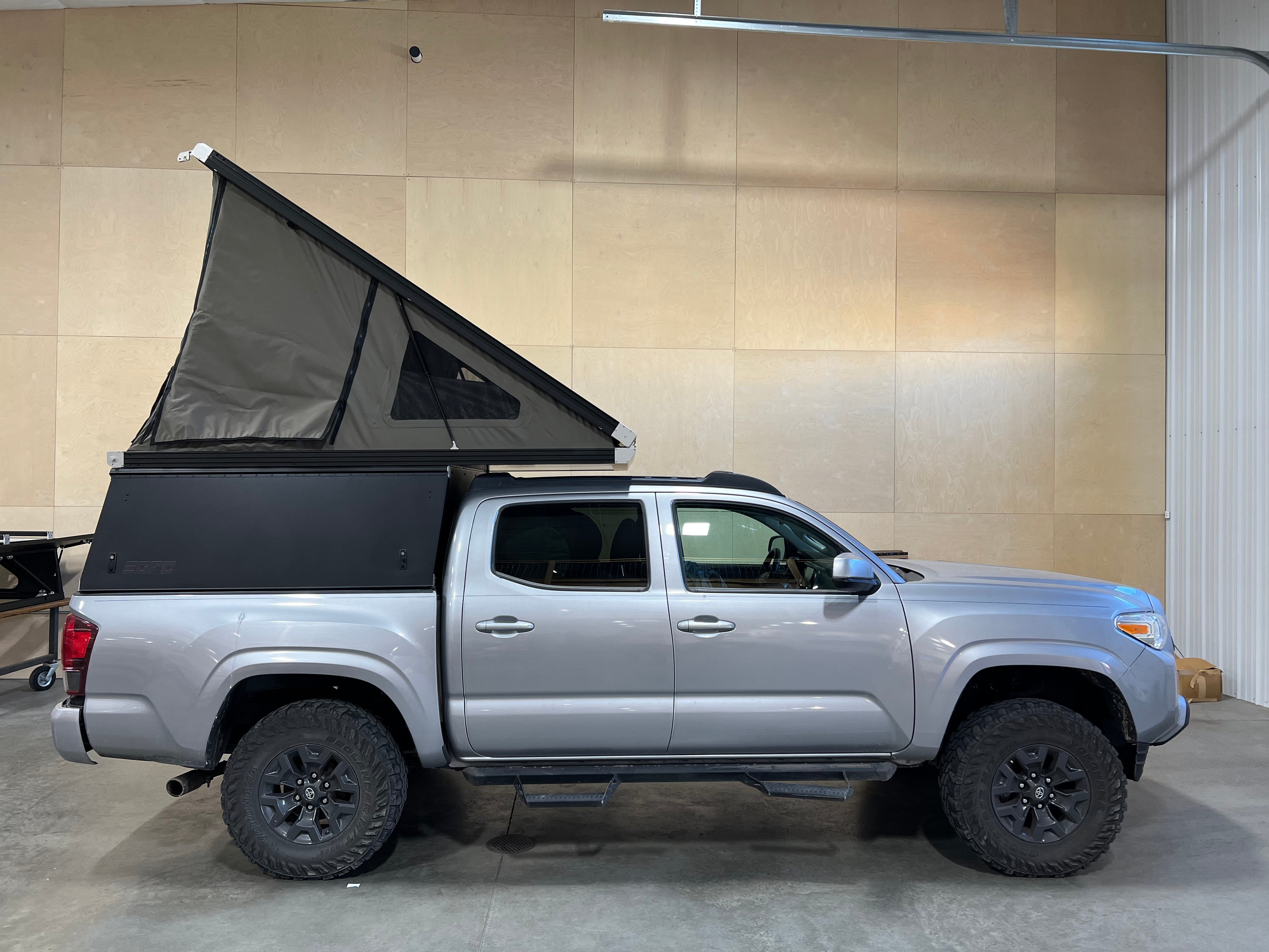 Product: Platform Camper Panel Color: Black GFC Options: Windows, Side Door Year: 2021 Make: Toyota Model: Tacoma Cab/Bed: Double Cab 5 foot Truck Color Silver Wheels: Stock Suspension: Stock Tire: Yokohama Geolander M/T 265/70/R16 Mods: All I need is a GFC Instagram Handle: Install Date: 2022-10-20 Location: CA