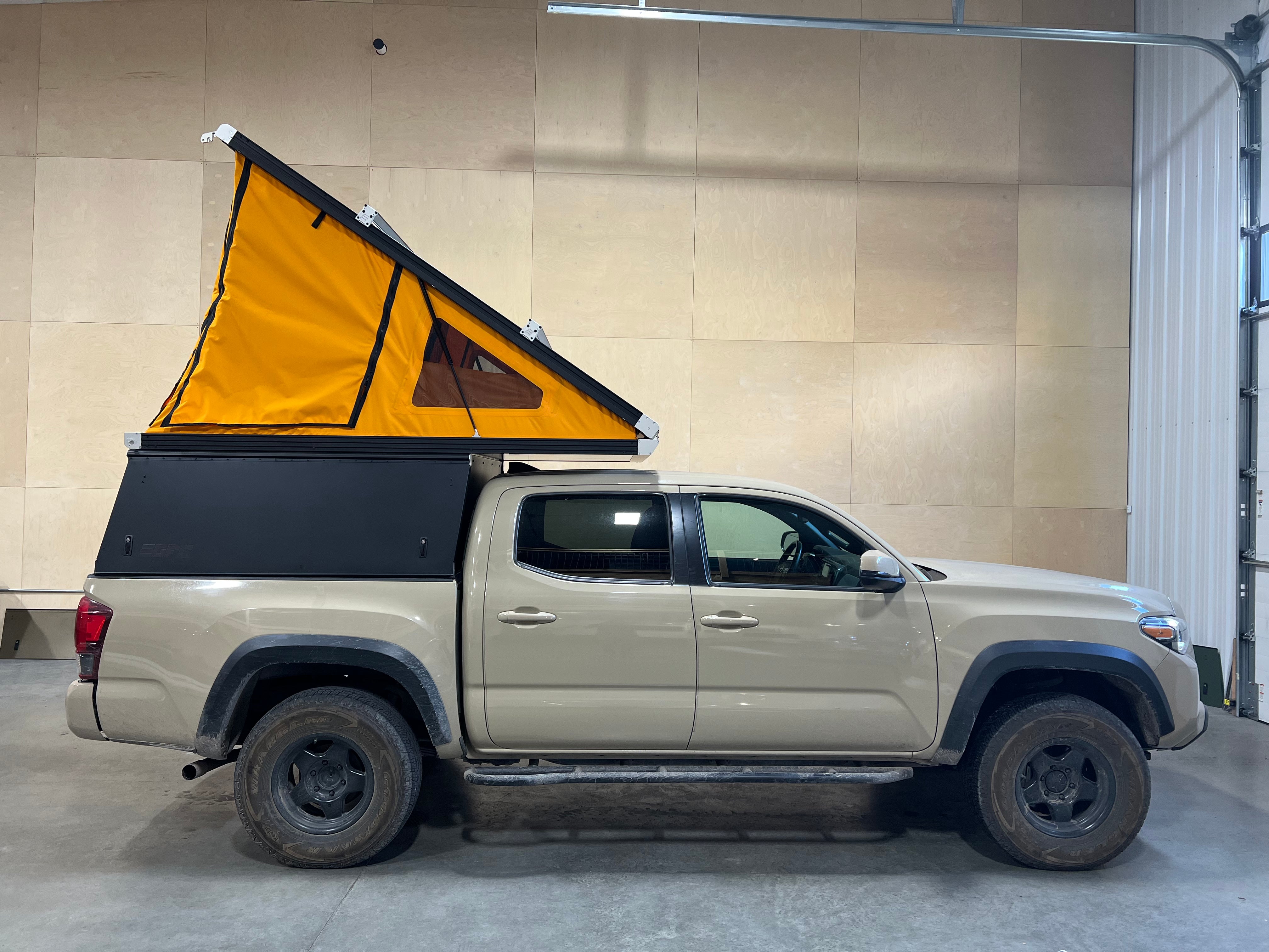 Product: Platform Camper Panel Color: Black GFC Options: Beef Rack Year: 2018 Make: Toyota Model: Tacoma Cab/Bed: Double Cab 5 foot Truck Color Tan Wheels: SCS Suspension: Stock Tire: Goodyear Wrangler 265/70/R16 Mods: All I need is a GFC Instagram Handle: Install Date: 2022-10-02 Location: WA