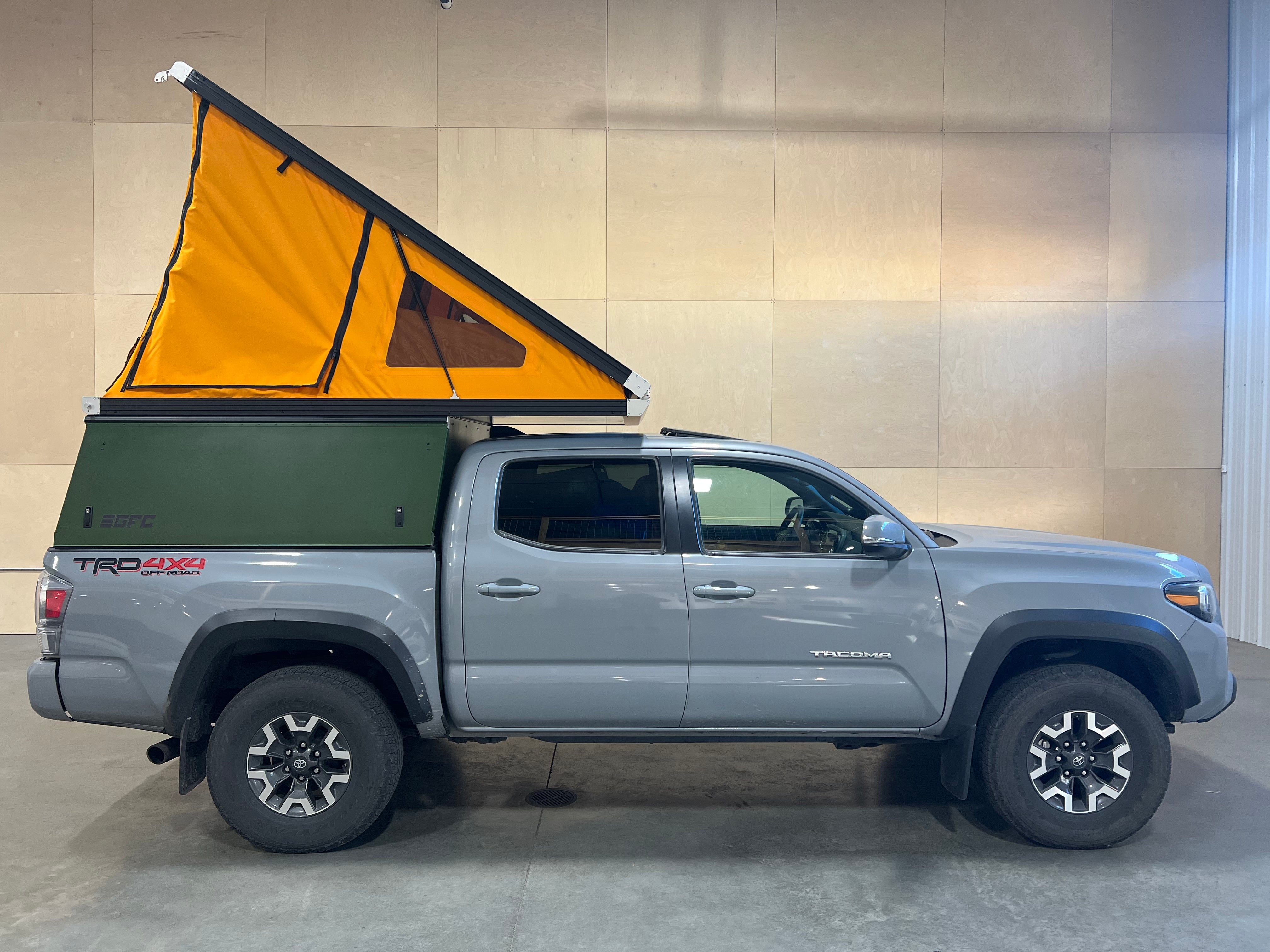 Product: Platform Camper Panel Color: Rifle Green GFC Options: Side Door Year: 2020 Make: Toyota Model: Tacoma Cab/Bed: Double Cab 5 foot Truck Color Gray Wheels: Stock Suspension: Stock Tire: Goodyear Wrangler 265/70/R16 Mods: All I need is a GFC Instagram Handle: None Install Date: 2022-10-08 Location: North Dakota