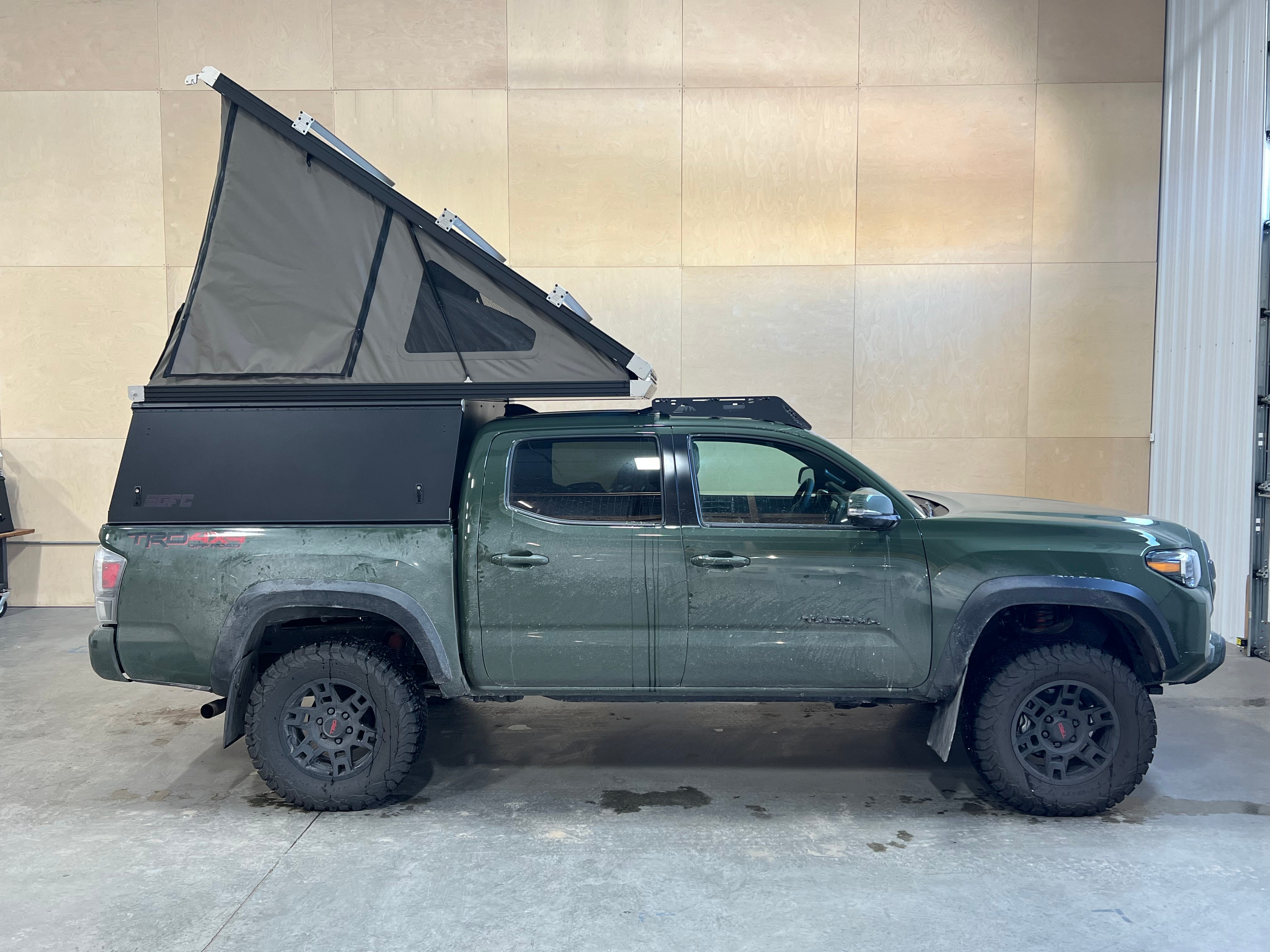 Product: Platform Camper Panel Color: Black GFC Options: Beef Rack, Side Door Year: 2022 Make: Toyota Model: Tacoma Cab/Bed: Double Cab 5 foot Truck Color Green Wheels: Stock Suspension: Stock Tire: BFG All terrain 265/70/r17 Mods: All I need is a GFC Instagram Handle: Install Date: 2022-11-12 Location: Belgrade