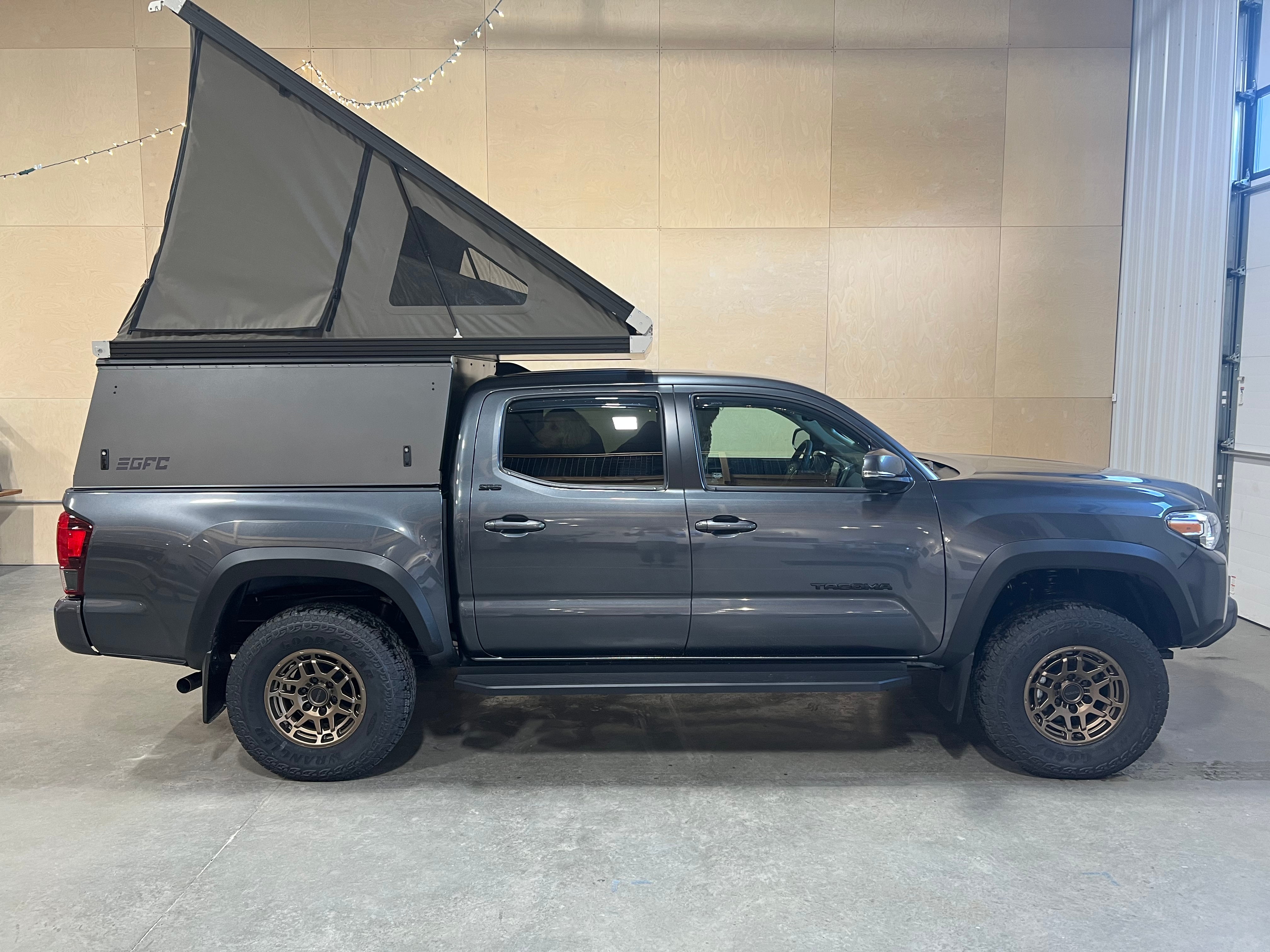 This 2023 Toyota Tacoma is outfitted with a GFC Platform Camper with Magnetic Gray Metallic panels. Check out more build specs below.