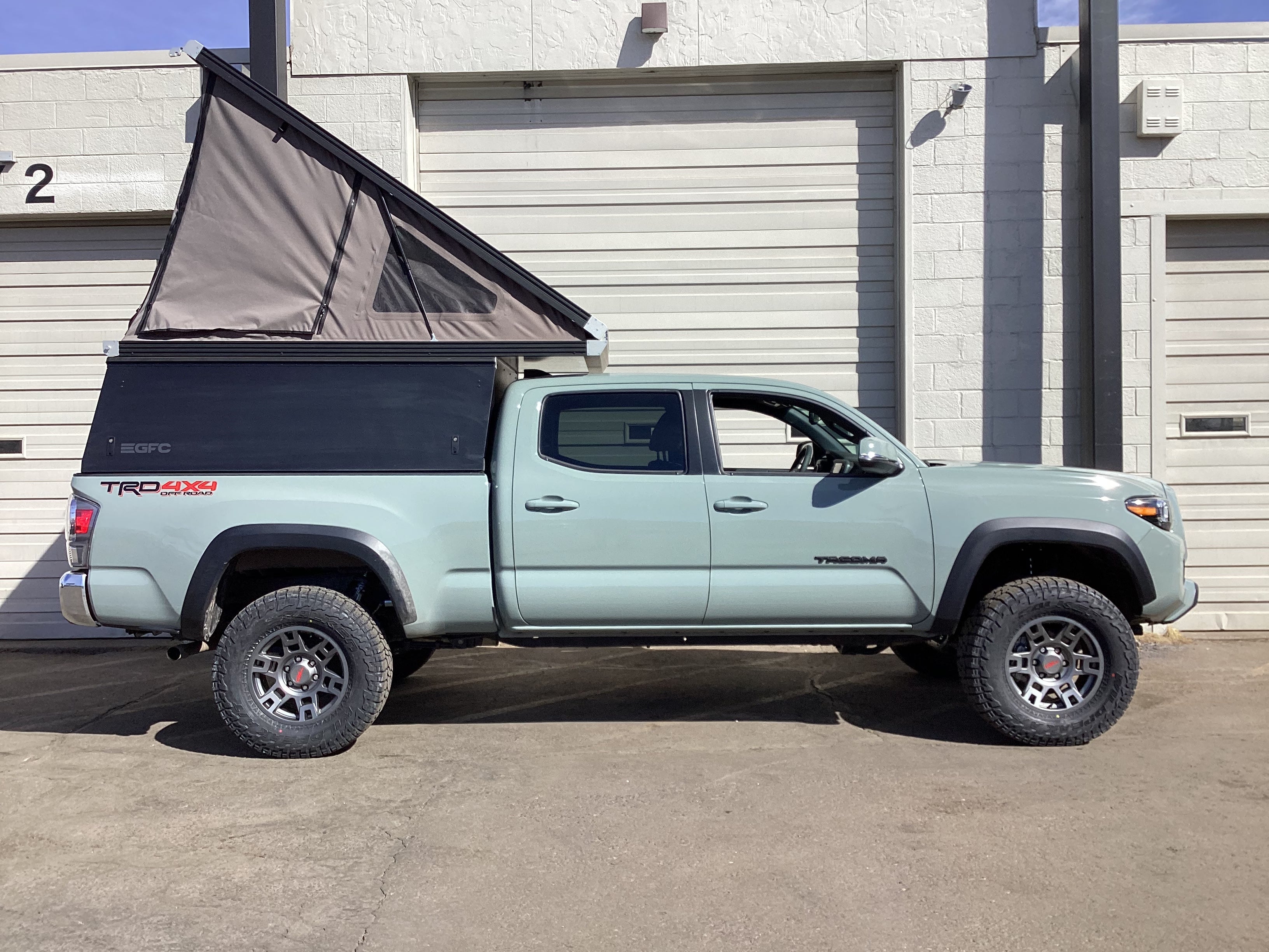 This 2023 Toyota Tacoma is outfitted with a GFC Platform Camper with Black panels. Check out more build specs below.