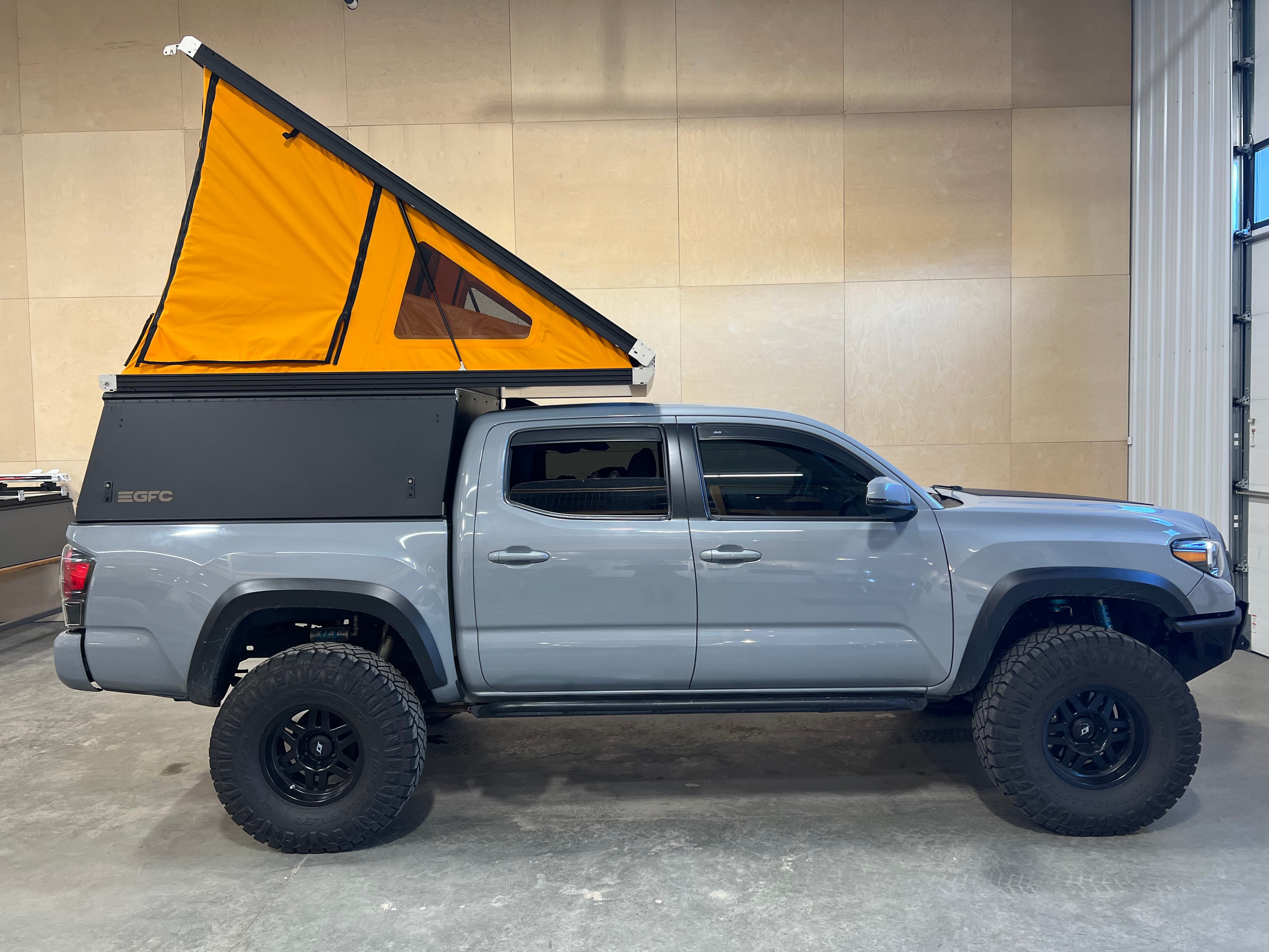 This 2020 Toyota Tacoma is outfitted with a GFC Platform Camper with Black panels. Check out more build specs below.