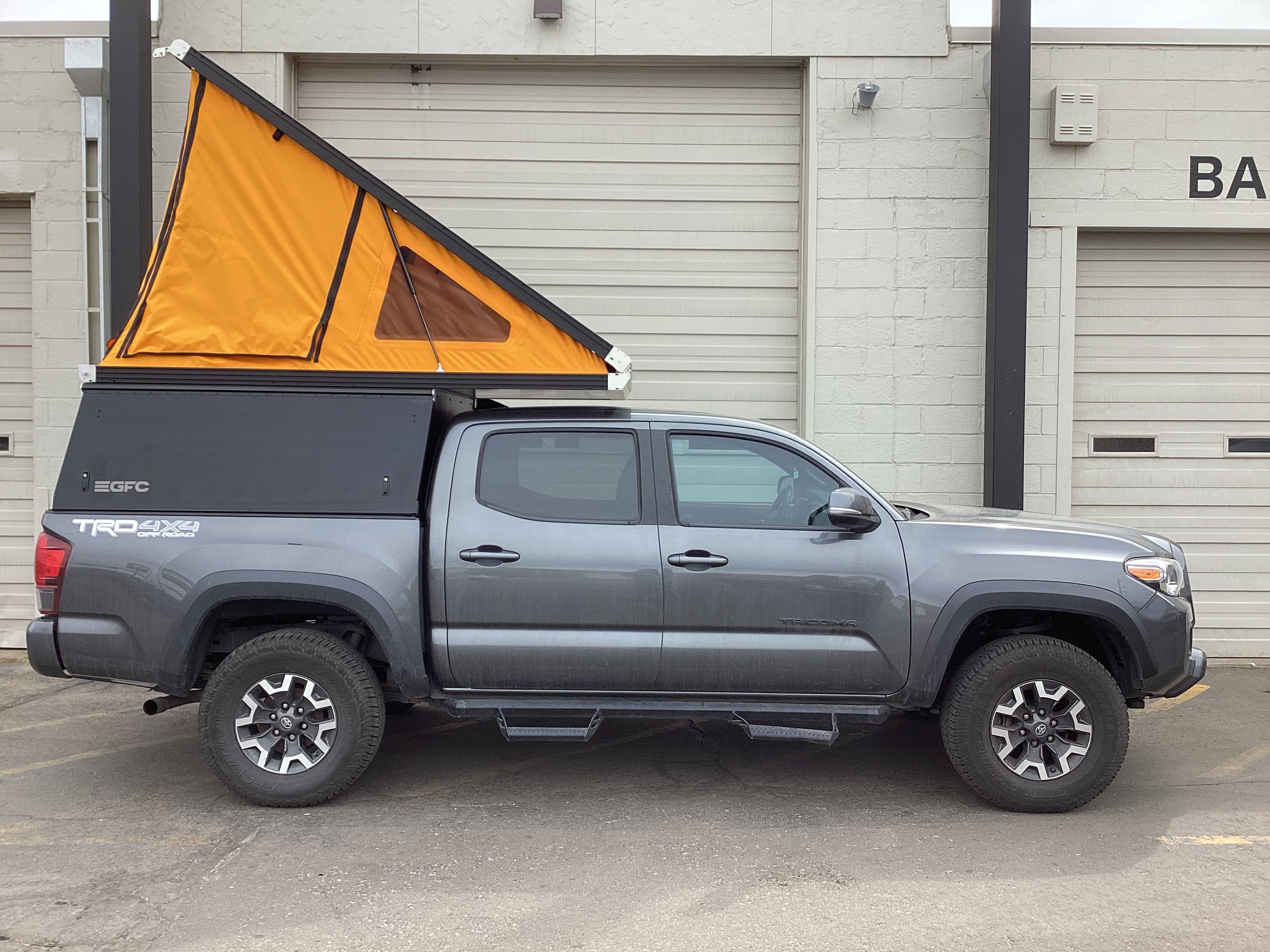 Product: Platform Camper Panel Color: Black GFC Options: Windows, Side Door Year: 2019 Make: Toyota Model: Tacoma Cab/Bed: Quad Cab 5 foot Truck Color Gray Wheels: Stock Suspension: Stock Tire: Yokohama Geolander A/T 265/70R16 Mods: All I need is a GFC Instagram Handle: Install Date: 2023-04-21 Location: Colorado