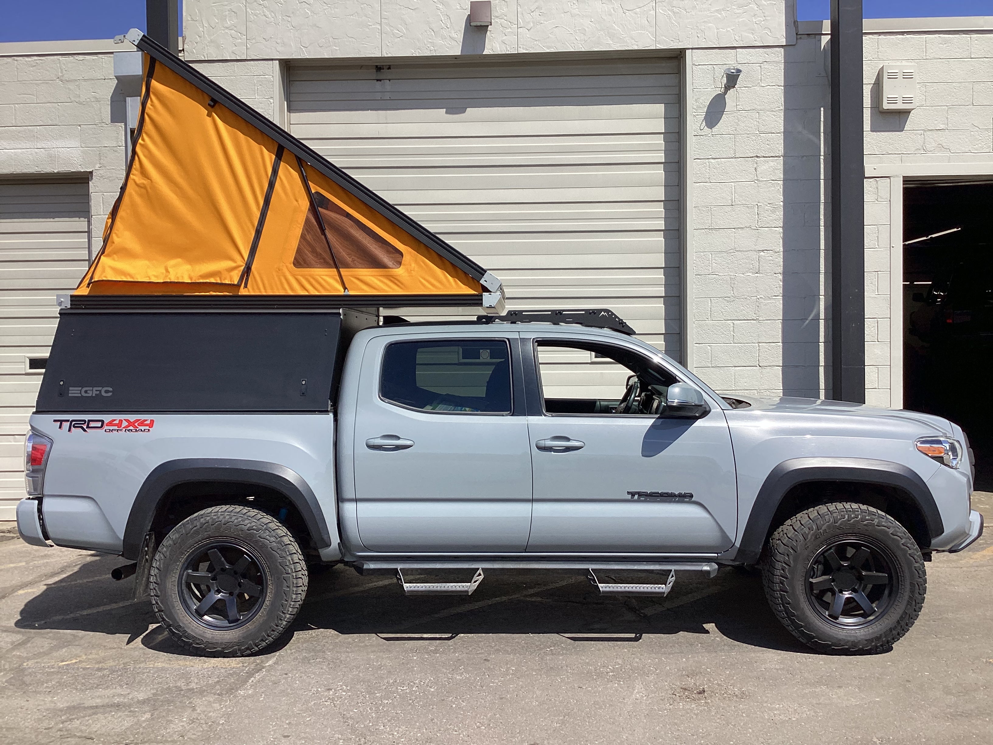 Product: Platform Camper Panel Color: Black GFC Options: Windows, Side Door Year: 2020 Make: Toyota Model: Tacoma Cab/Bed: Quad Cab 5 foot Truck Color Gray Wheels: Level 8 Suspension: Stock Tire: Falken Wildpeak ATW3 265/70R17 Mods: All I need is a GFC Instagram Handle: Install Date: 2023-05-01 Location: Colorado
