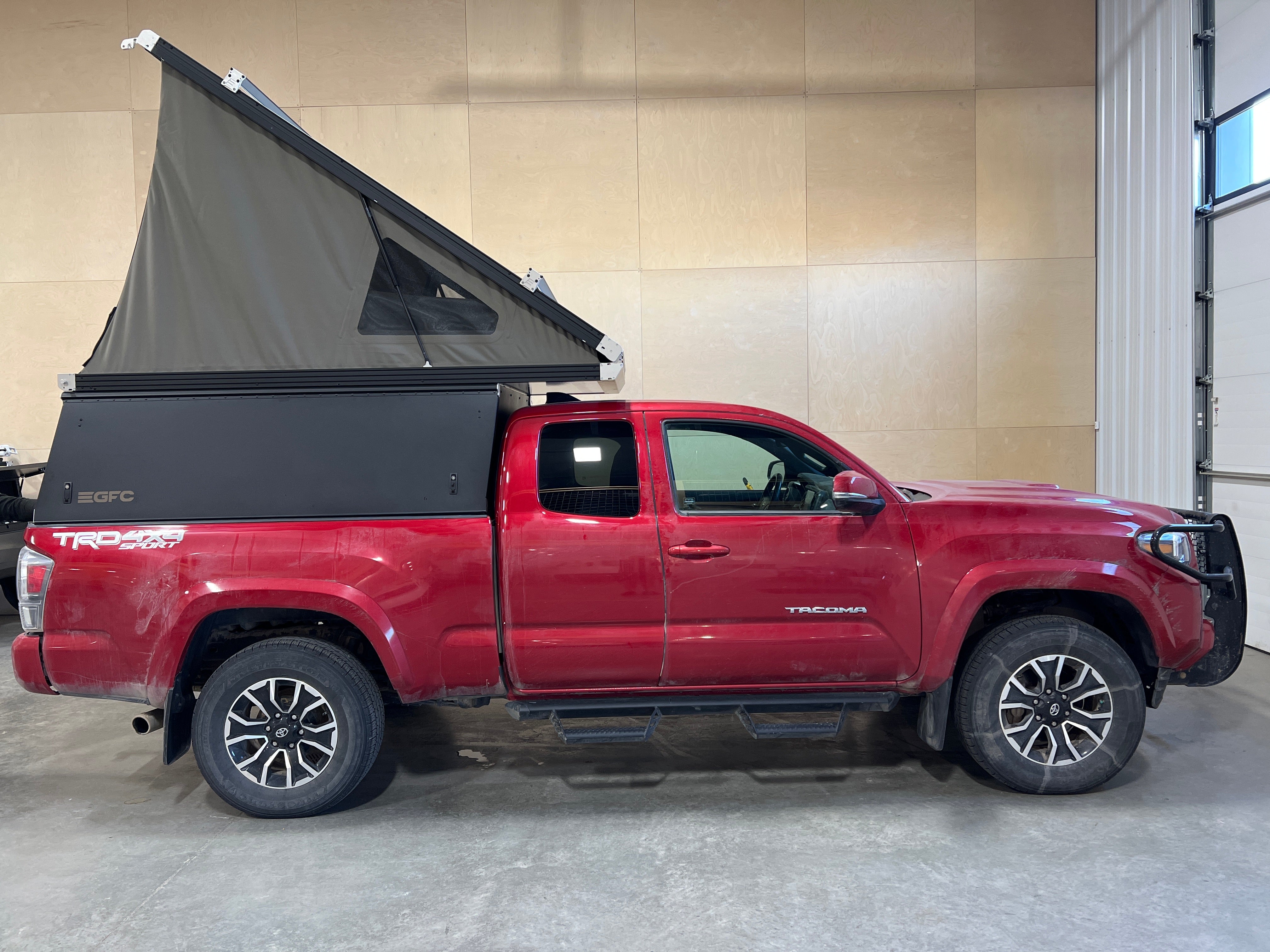 Product: Platform Camper Panel Color: Black GFC Options: Beef Rack, Windows Year: 2021 Make: Toyota Model: Tacoma Cab/Bed: Access Cab 6 Foot Truck Color Red Wheels: Stock Suspension: Stock Tire: Firestone Destination AT 265/70/R16 Mods: All I need is a GFC Instagram Handle: None Install Date: 2023-04-15 Location: Colorado