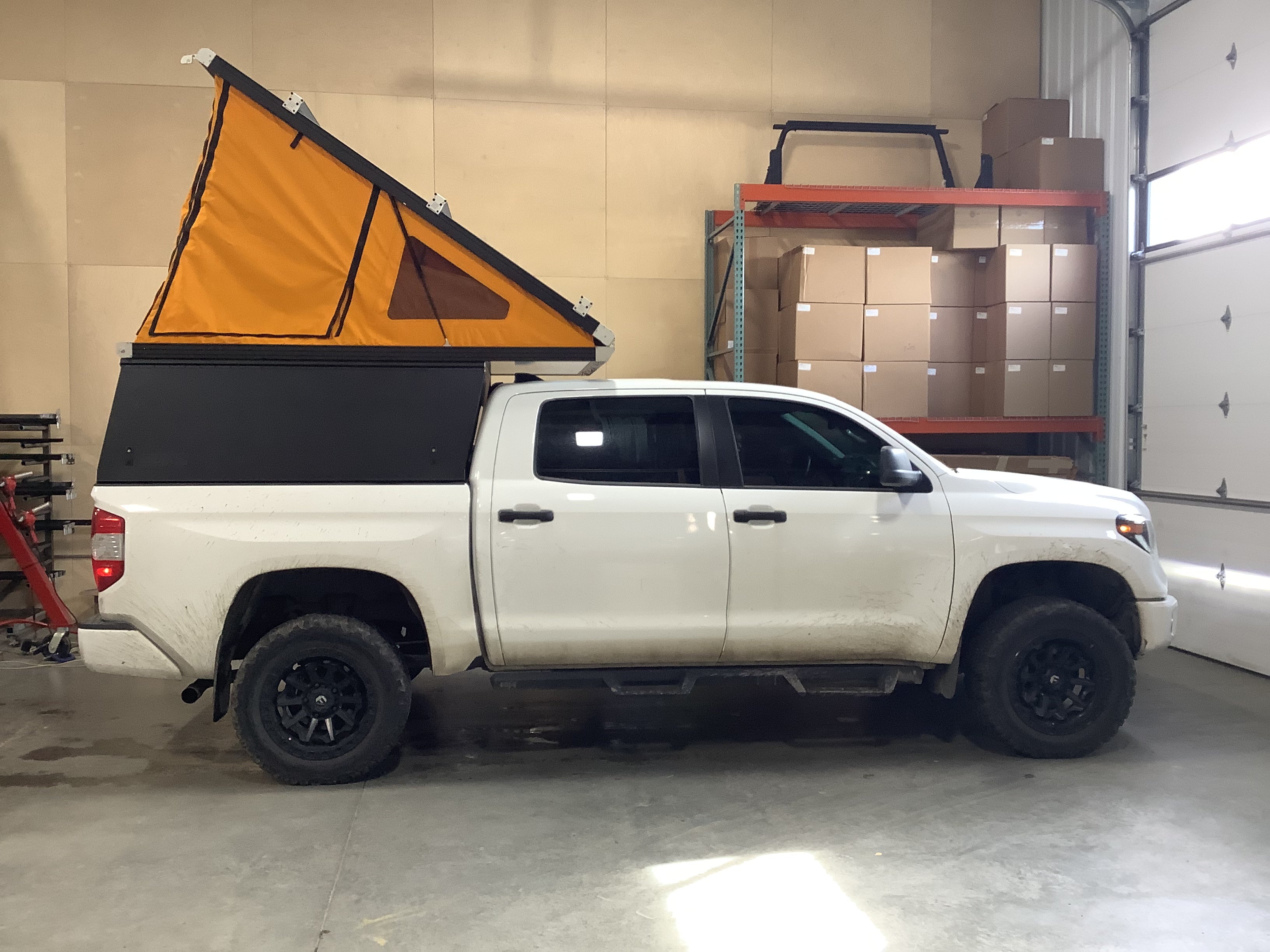 Product: Platform Camper Panel Color: Black GFC Options: Windows, Side Door, Beef Rack Year: 2020 Make: Toyota Model: Tundra Cab/Bed: Double Cab 5 foot Truck Color White Wheels: Fuel Suspension: Stock Tire: BFG KO2 285/70/R18 Mods: All I need is a GFC Instagram Handle: None Install Date: 2022-06-03 Location: Washington