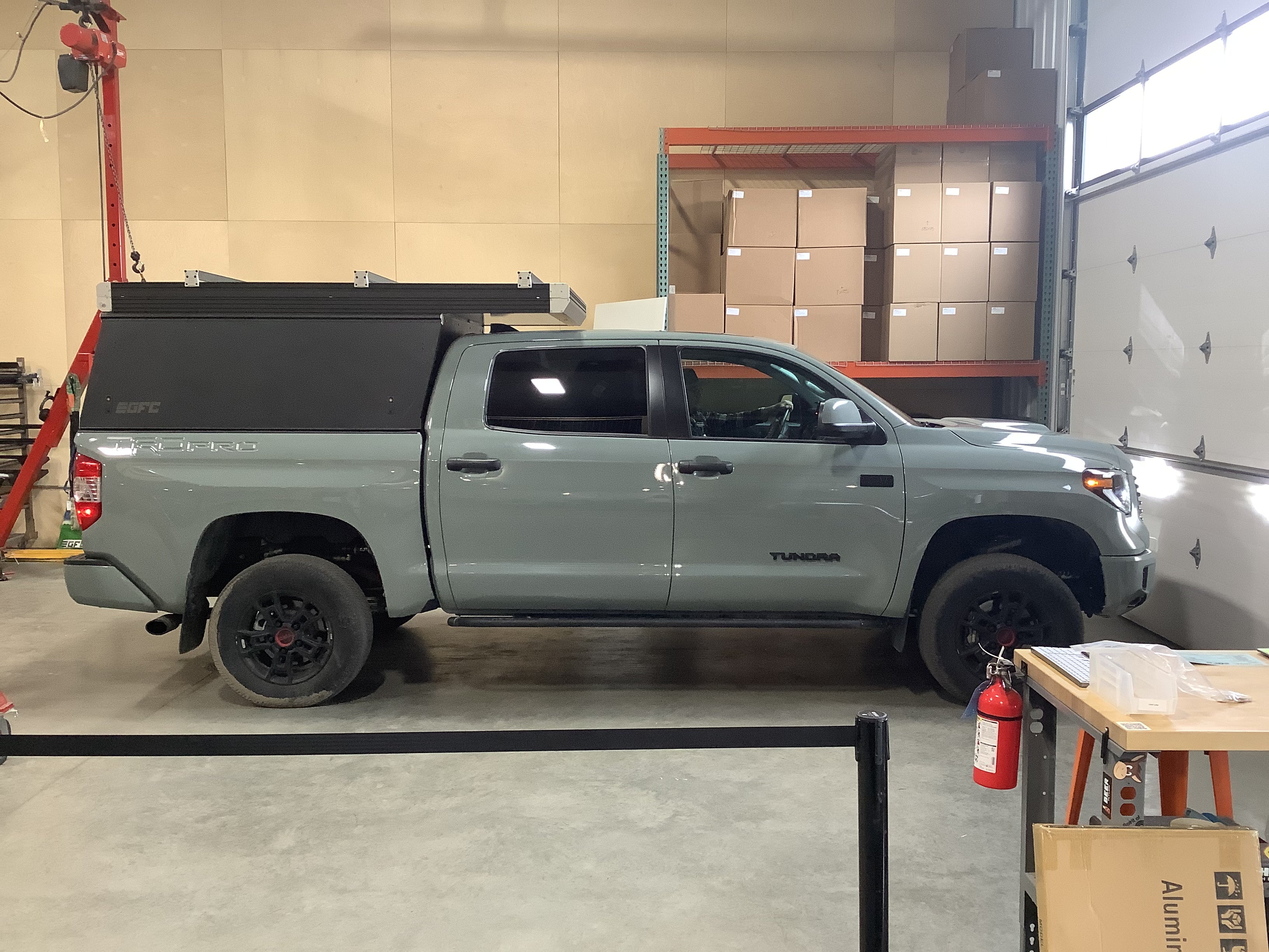 Product: Platform Camper Panel Color: Black GFC Options: Beef Rack, Windows, Side Door Year: 2021 Make: Toyota Model: Tundra Cab/Bed: Crew Cab 5 foot Truck Color Gray Wheels: Stock Suspension: Camburg, Fox Tire: Michelin Defender 265/70/R18 Mods: All I need is a GFC Instagram Handle:@beepleboopabout Install Date: 2022-03-25 Location: California