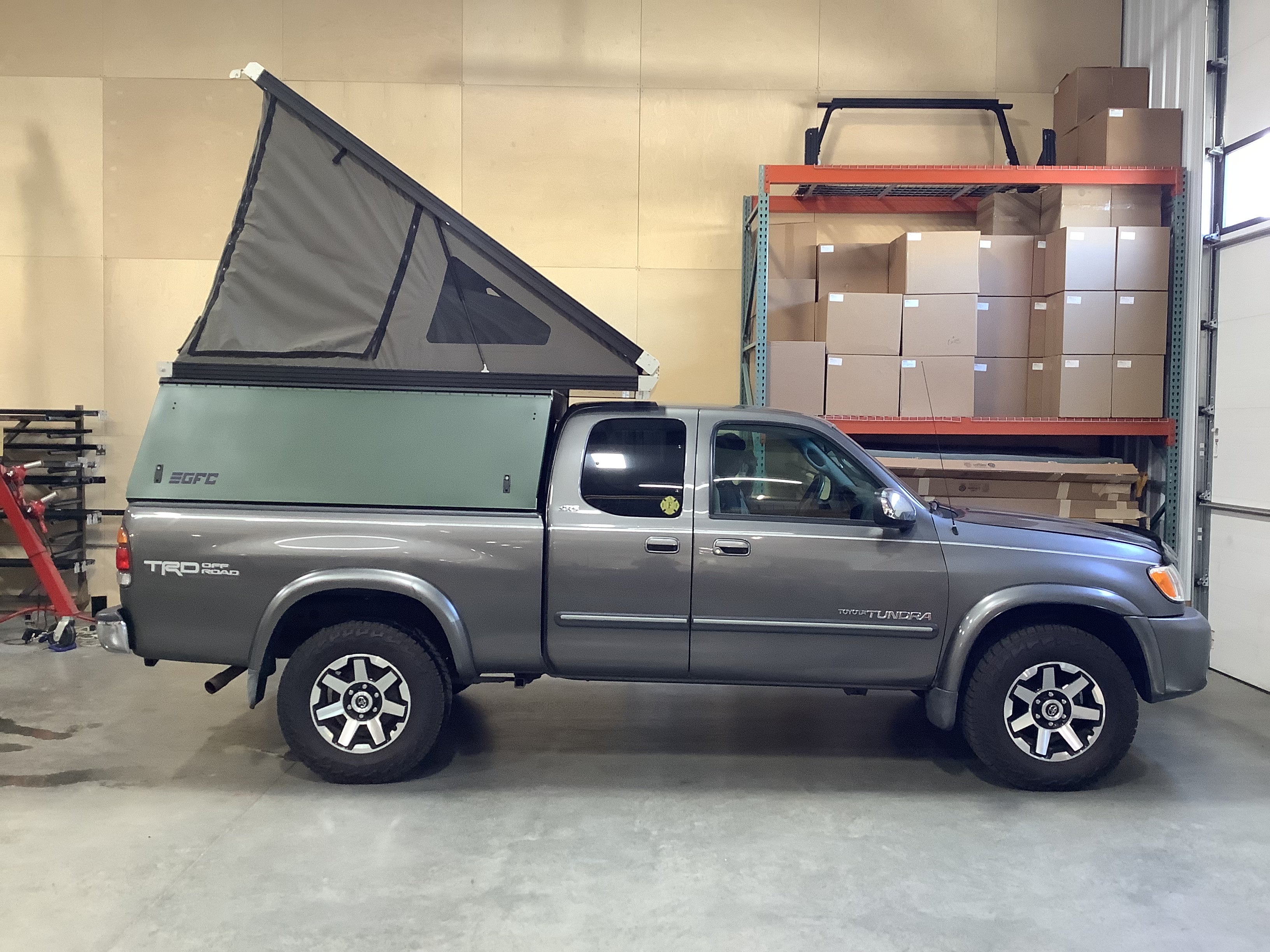 Product: Platform Camper Panel Color: Rifle Green GFC Options: Windows Year: 2003 Make: Toyota Model: Tundra Cab/Bed: Access Cab 6 Foot Truck Color Gray Wheels: Stock Suspension: Stock Tire: Falken Wildpeak 265/70/R17 Mods: All I need is a GFC Instagram Handle: Install Date: 2022-06-09 Location: Washington