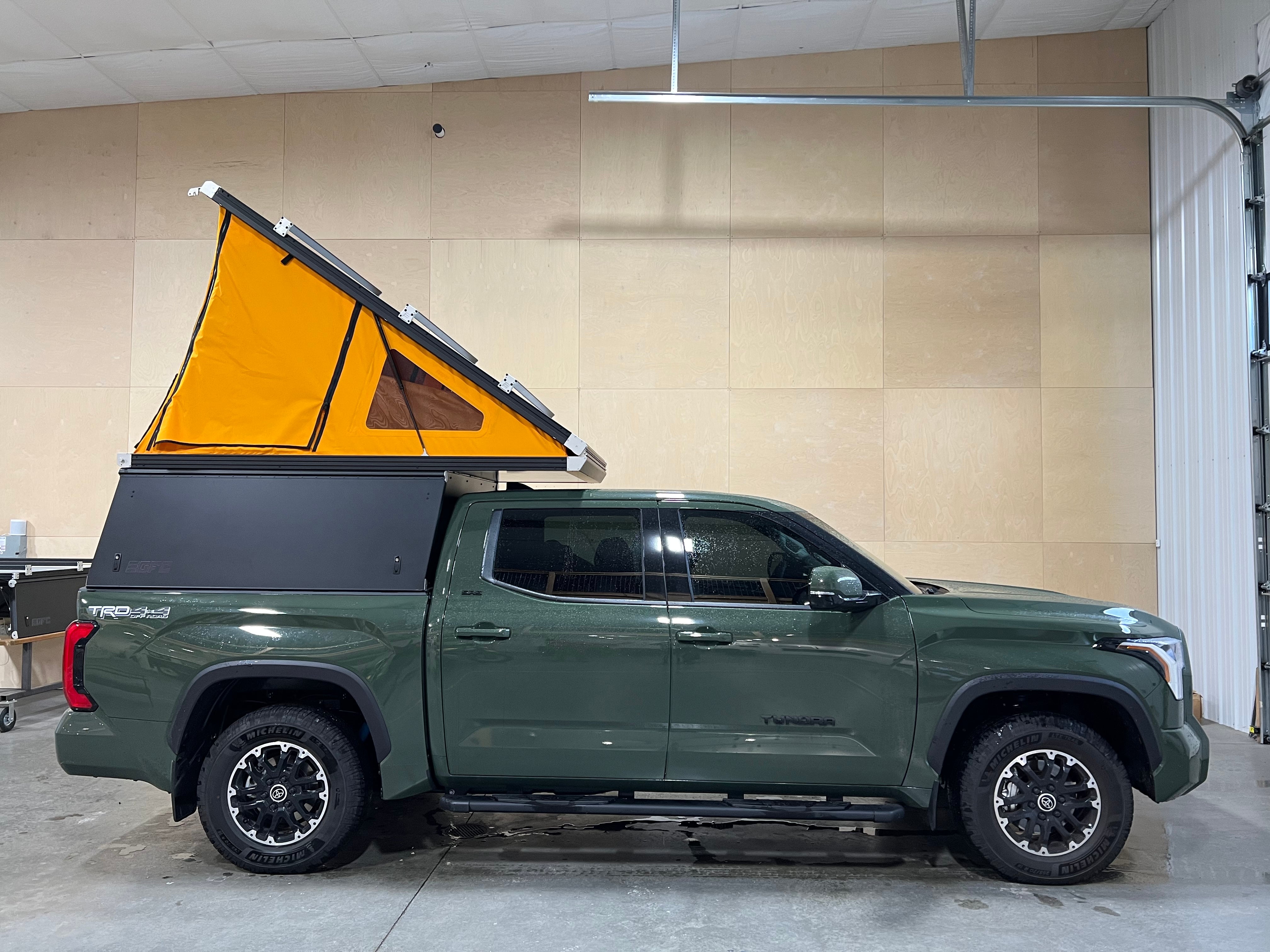Product: Platform Camper Panel Color: Black GFC Options: Beef Rack, Side Door Year: 2022 Make: Toyota Model: Tundra Cab/Bed: Double Cab 6 Foot Truck Color Green Wheels: Stock Suspension: Stock Tire: Michelin 265/70/R18 Mods: All I need is a GFC Instagram Handle: Install Date: 2022-10-23 Location: MO