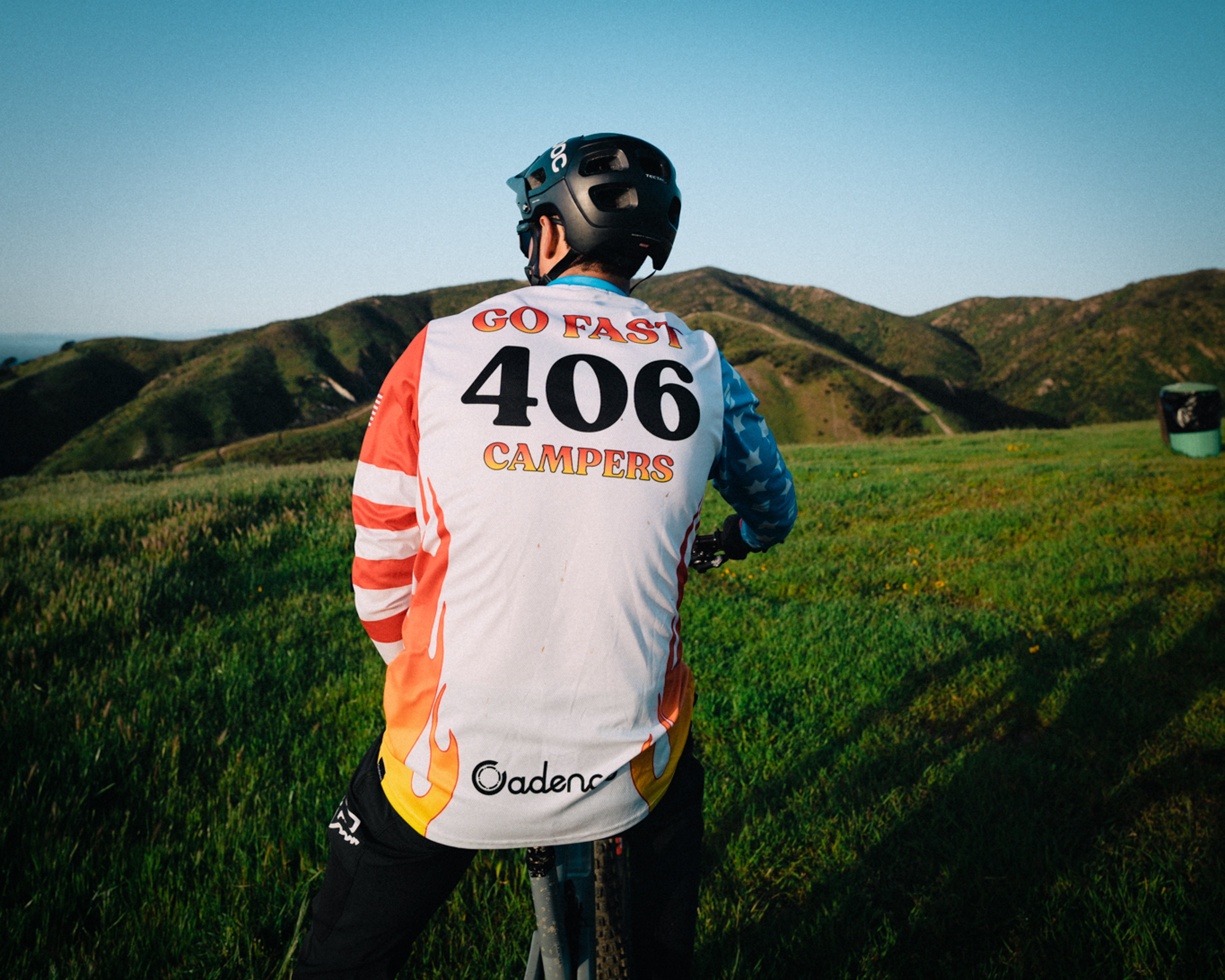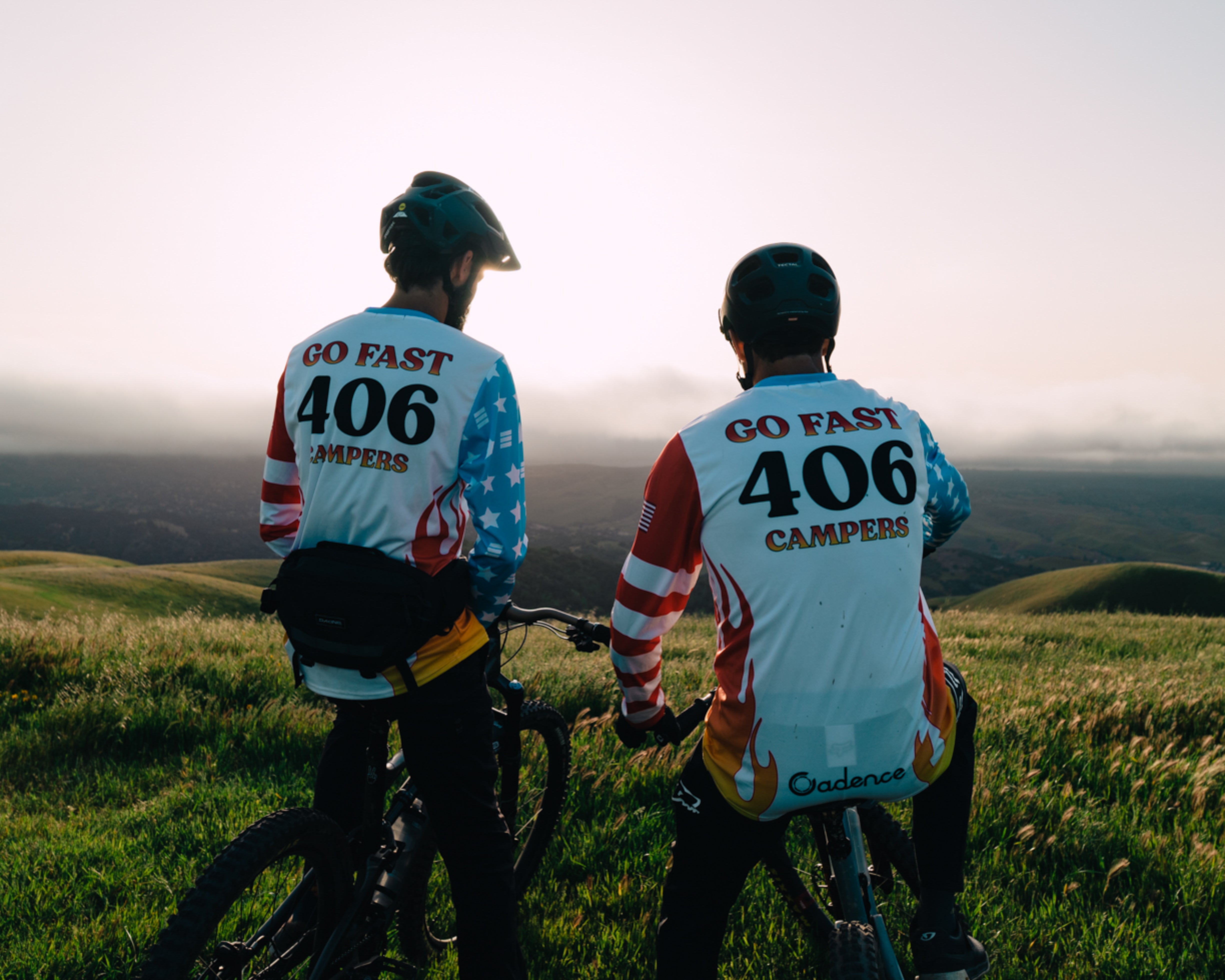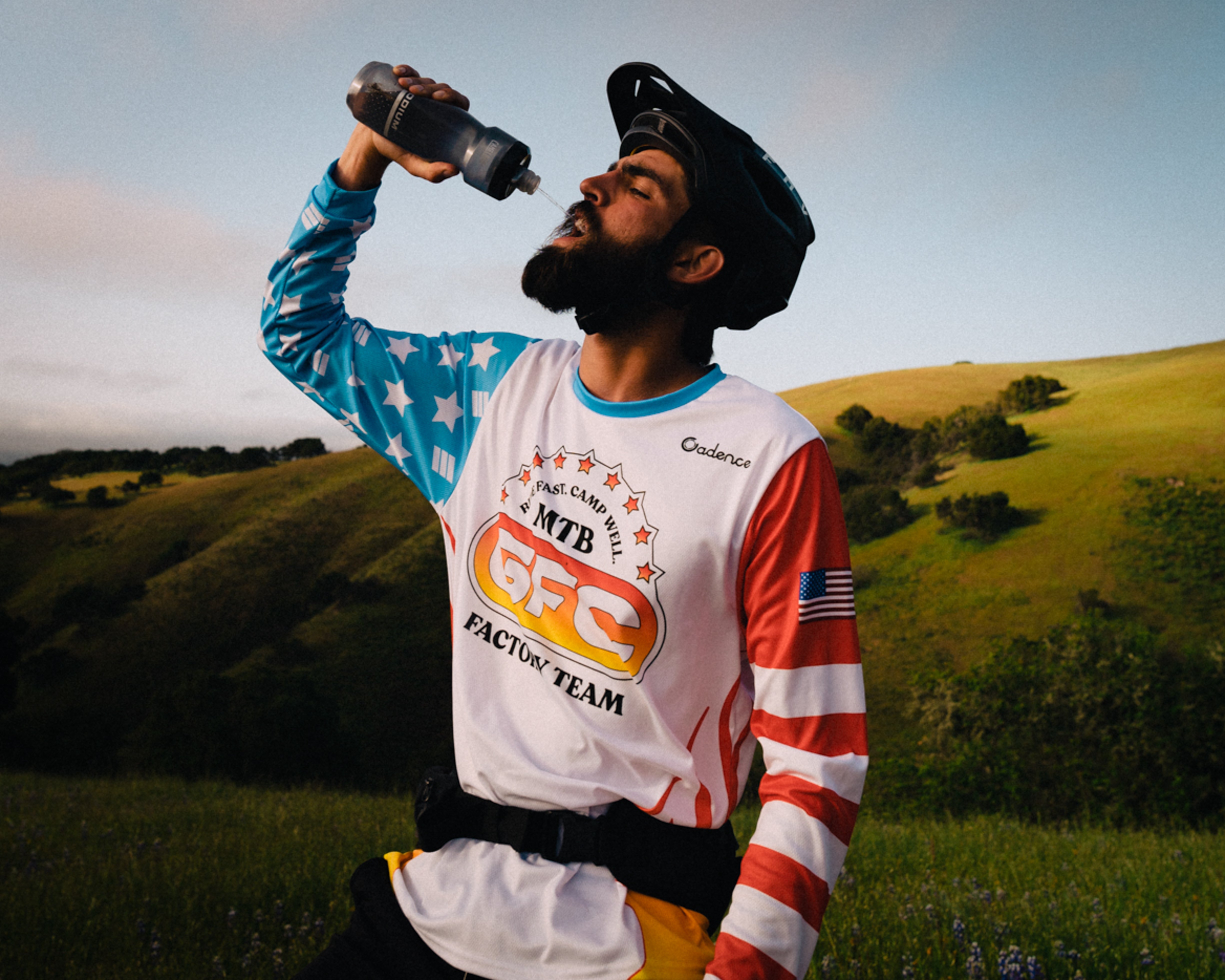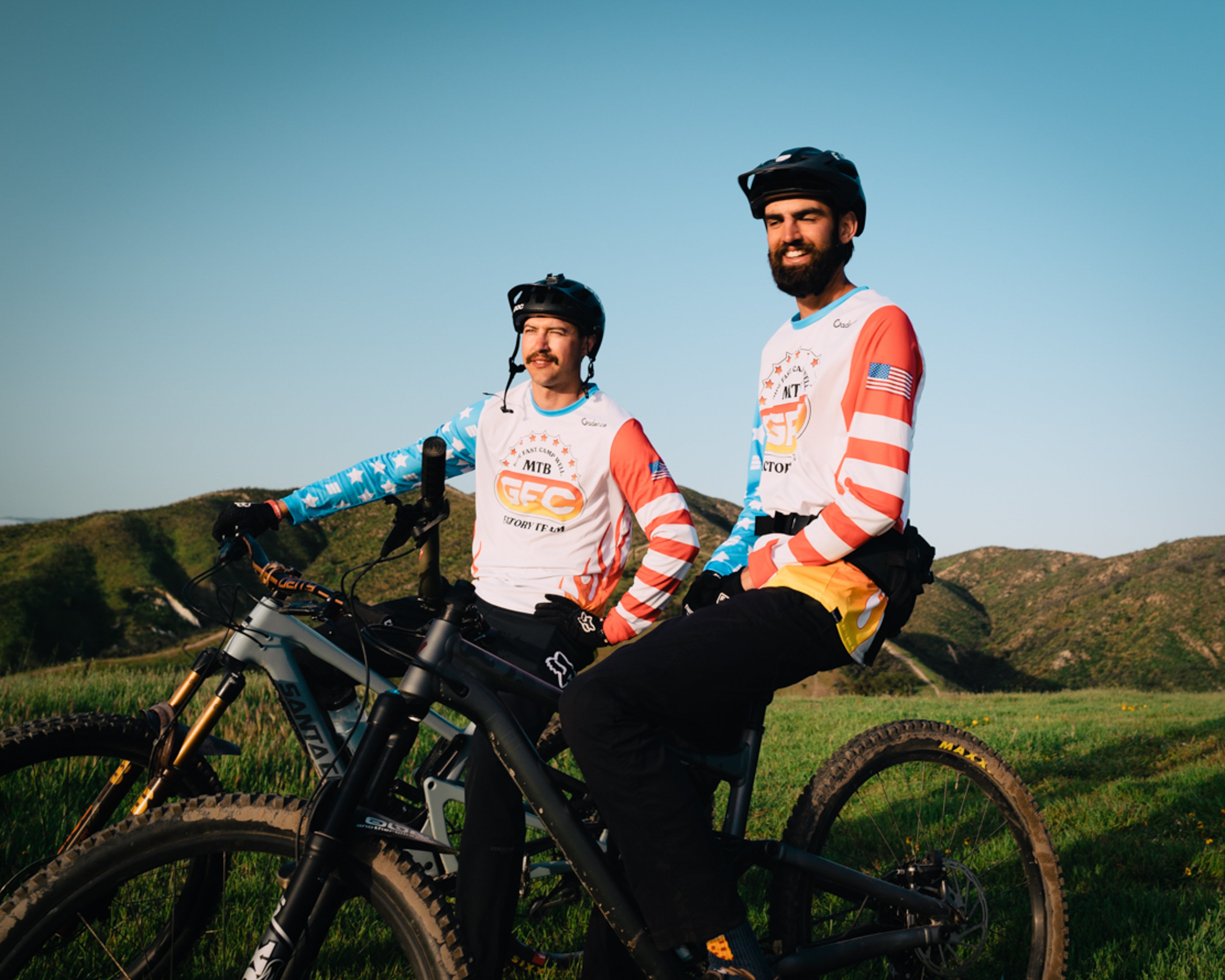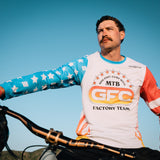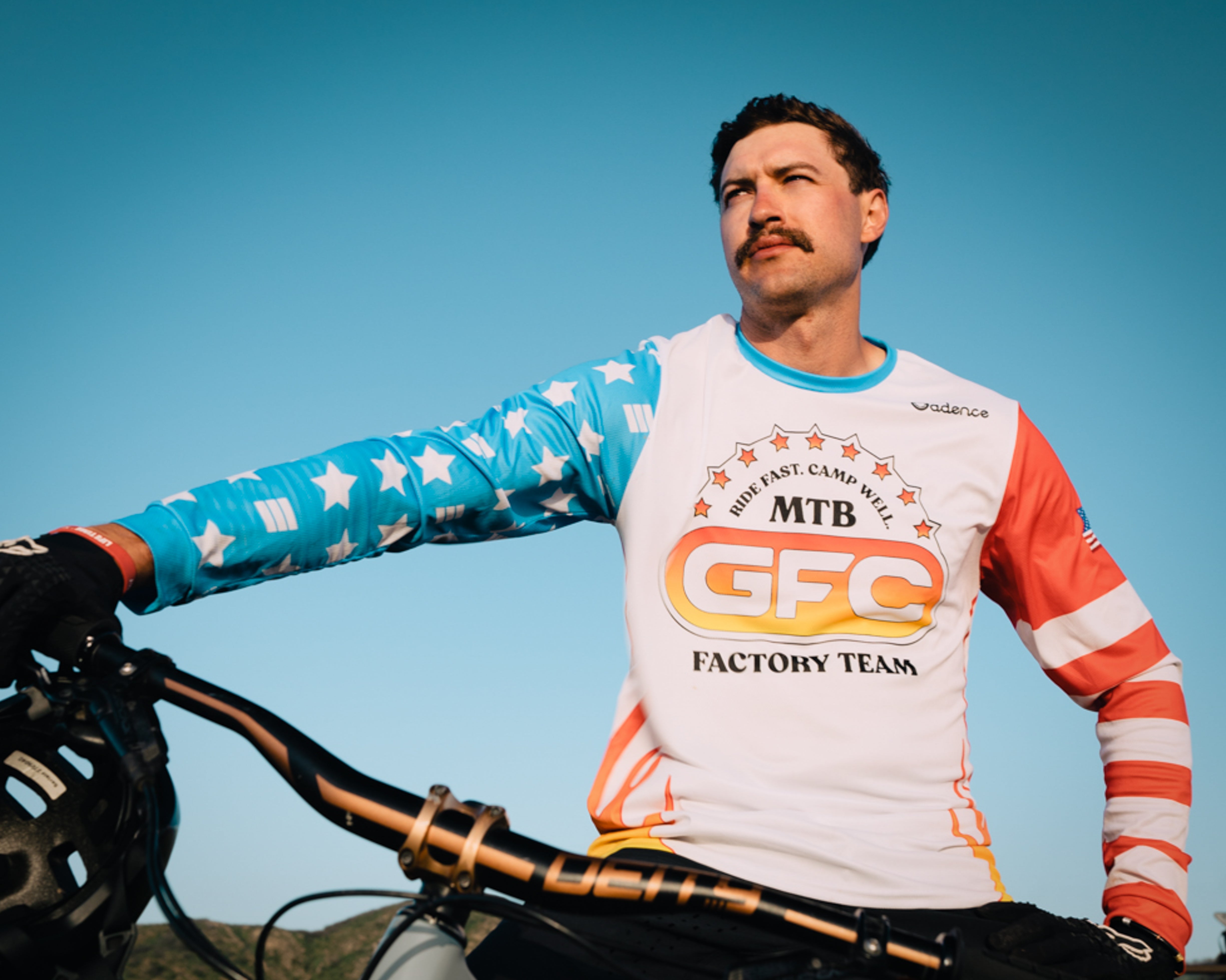 Ride faster, fall even harder, and look damn good doing it. We teamed up with Cadence, experts in bike apparel, to bring you a custom mountain bike jersey that screams of all-American glory. So picture this: a white base with fiery orange flames blazing up the sides, your sleeves are paying homage to the stars and stripes, and some rando is thinking you're sponsored as hell as they read "Factory Team" across your chest. Pretty neat, right?