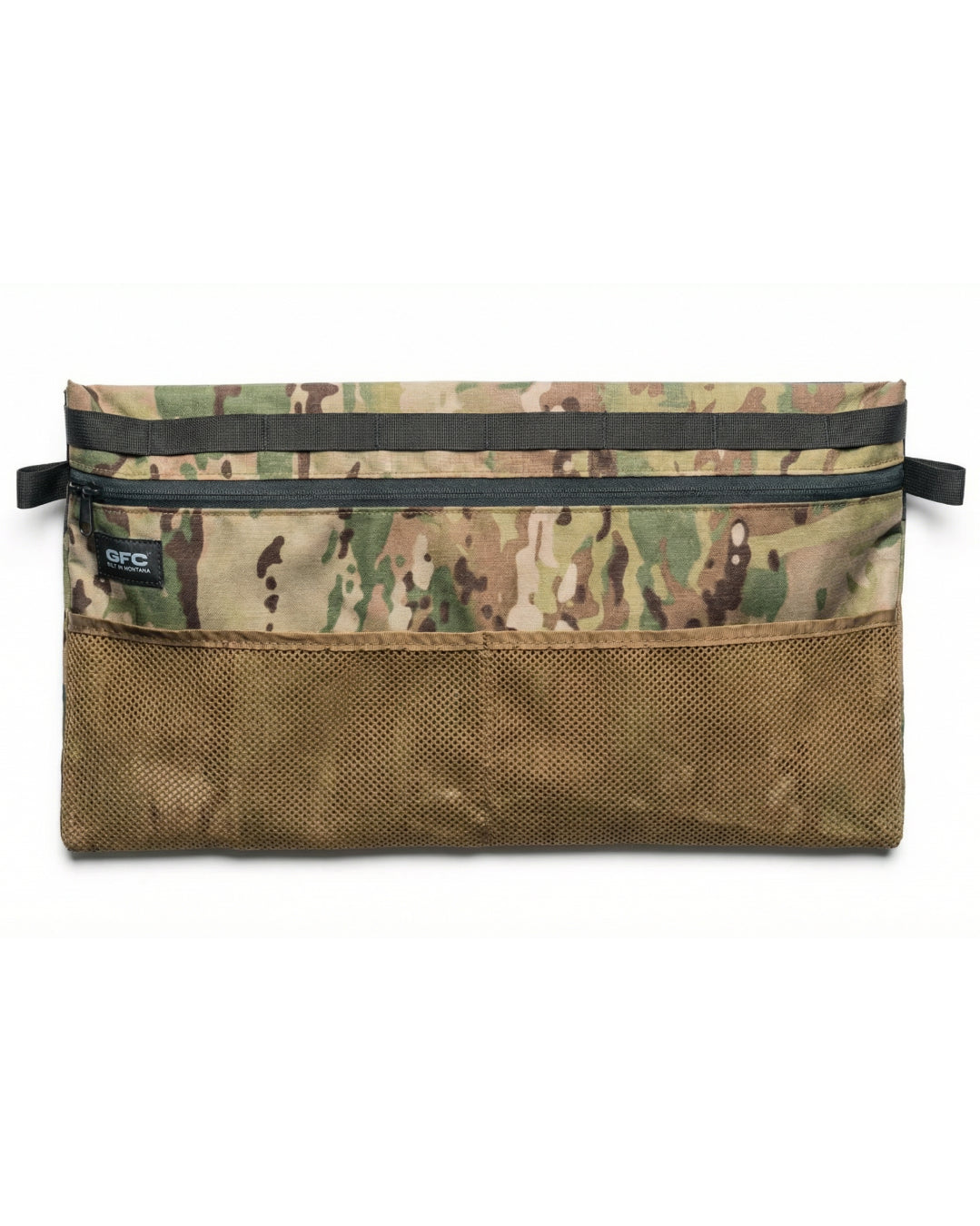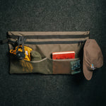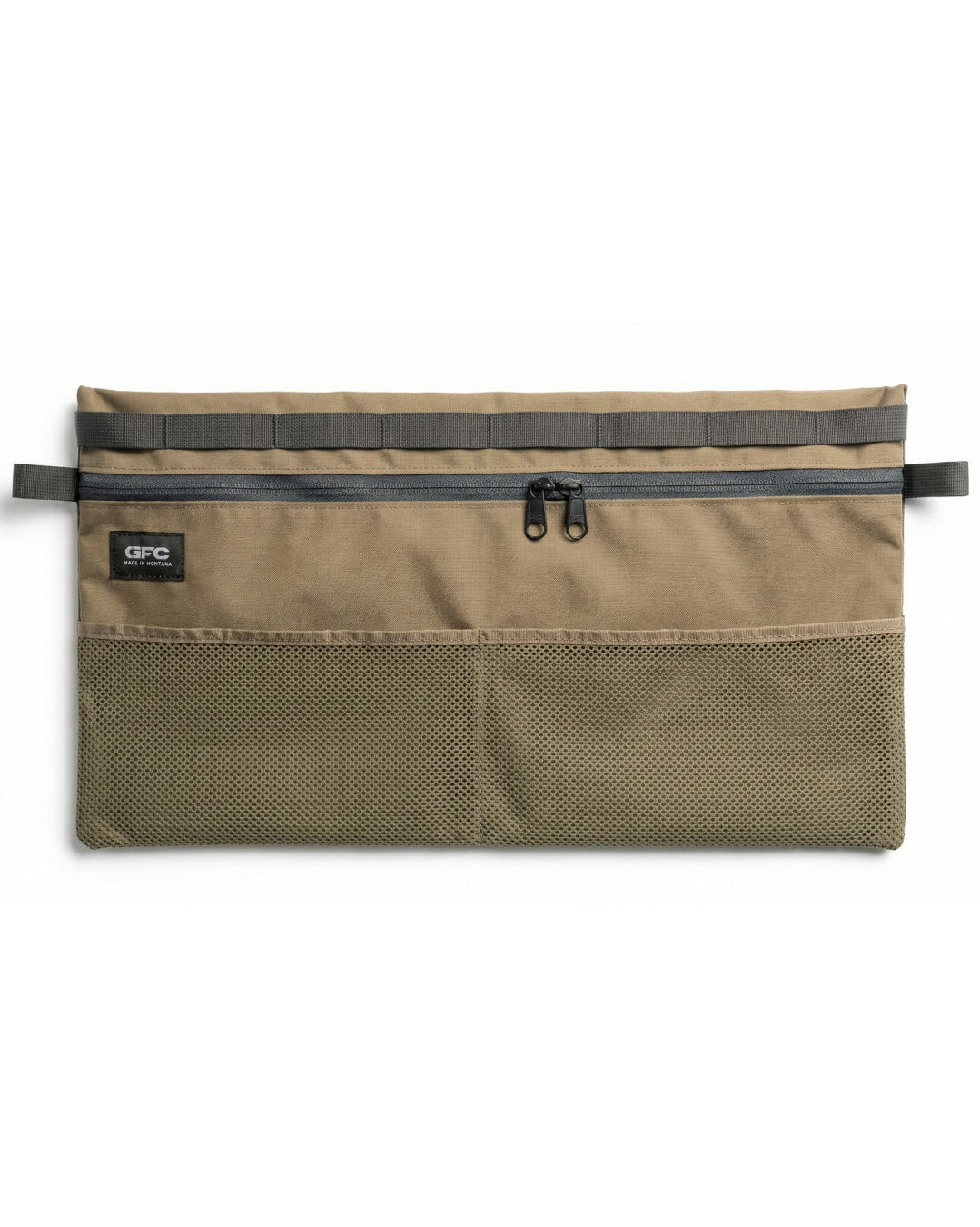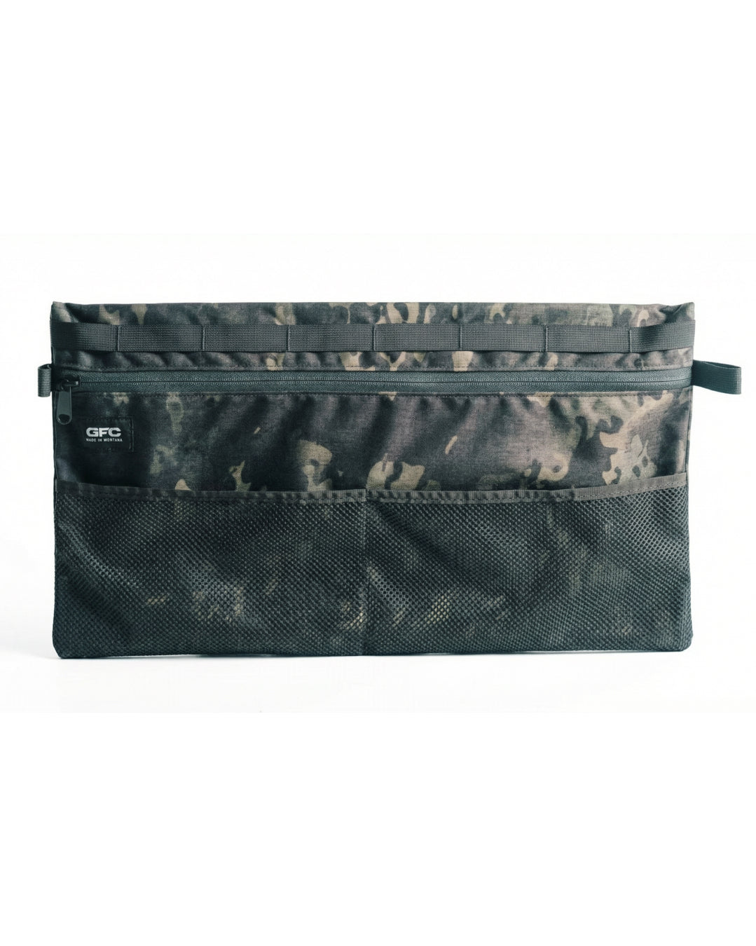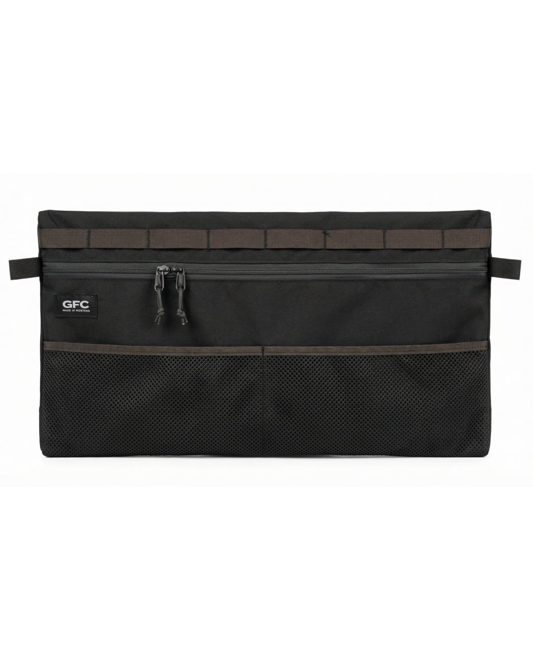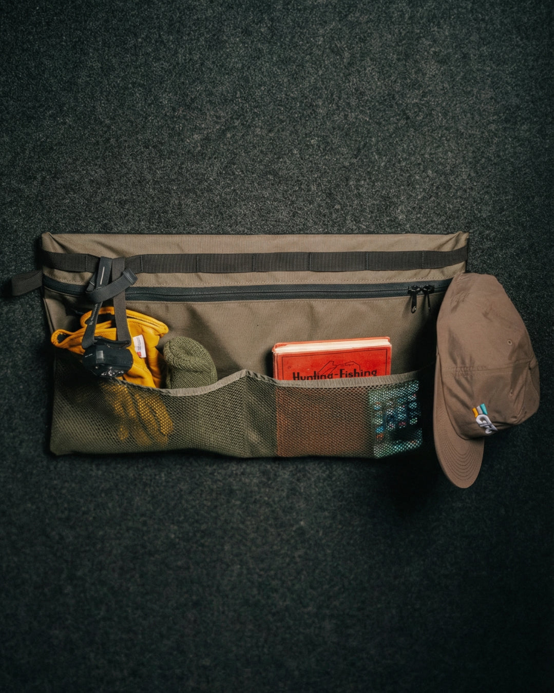 The Top Shelf is the ultimate rooftop storage solution, featuring a massive zippered primary cargo pocket, dual see-through mesh net storage compartments, and a webbing daisy chain for accessory attachment.
