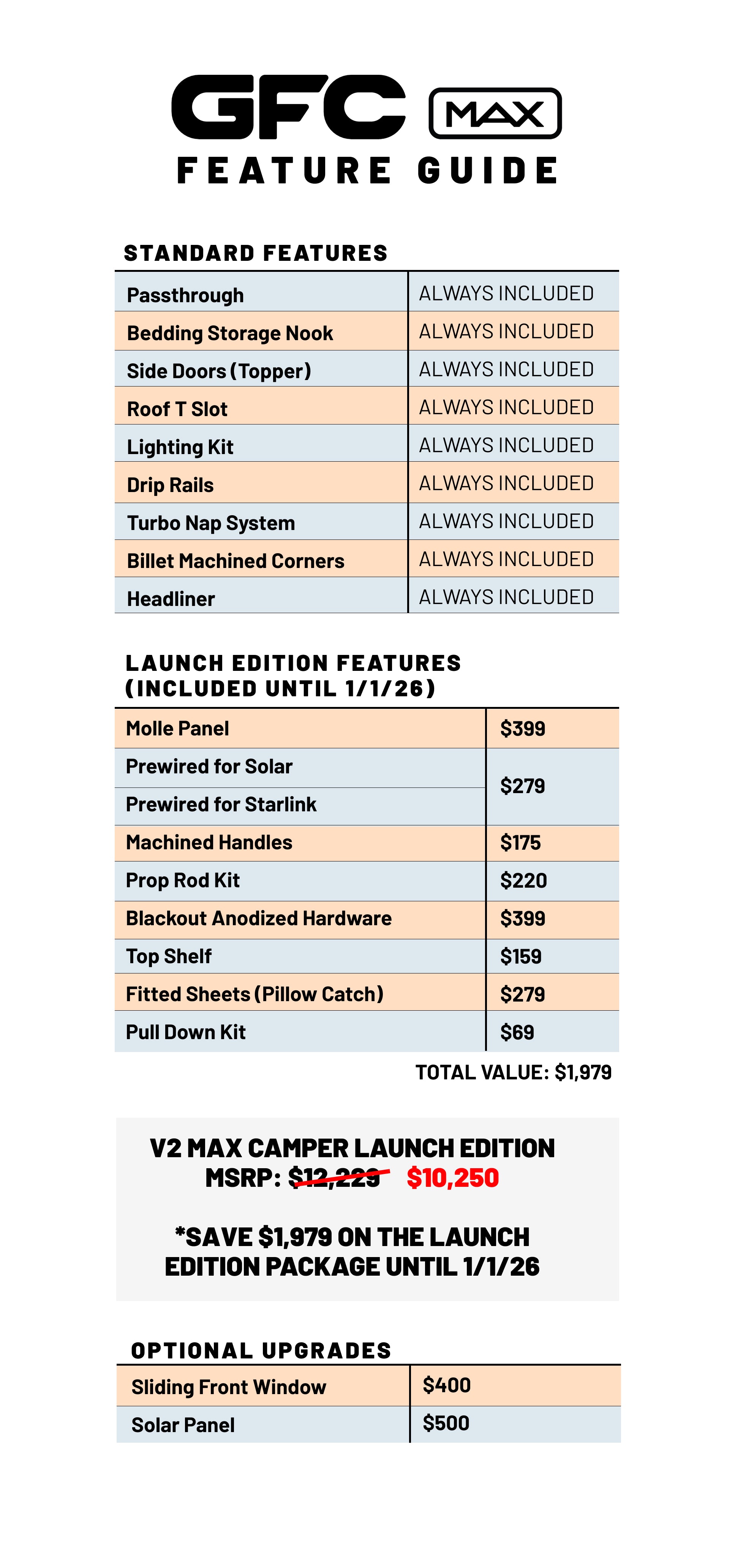 The V2 Max Launch Edition is our latest evolution of the GFC Platform Camper—longer, smarter, and built for bigger adventures. It features a longer tent, upgraded structure, integrated wiring for solar/Starlink, and a ton of built-in accessories. We’re including it all at launch, until the end of 2025. This package is subject to change at the new year.